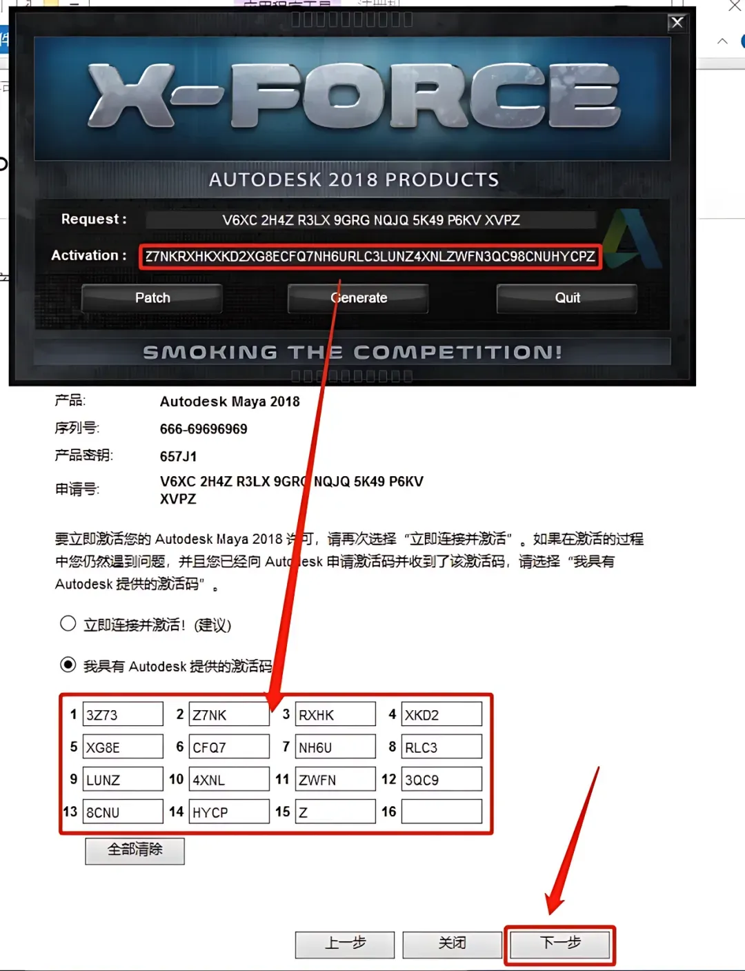 21.全部选中Activeation中生成的激活码(仔细检查是否复制完整),使用Ctrl+C键或者鼠标右击复制生成的激活码,然后粘贴激活码至我具有Autodesk提供的激活码方框中,最后点击下一步