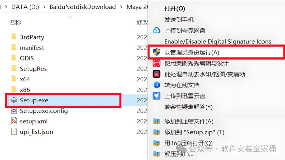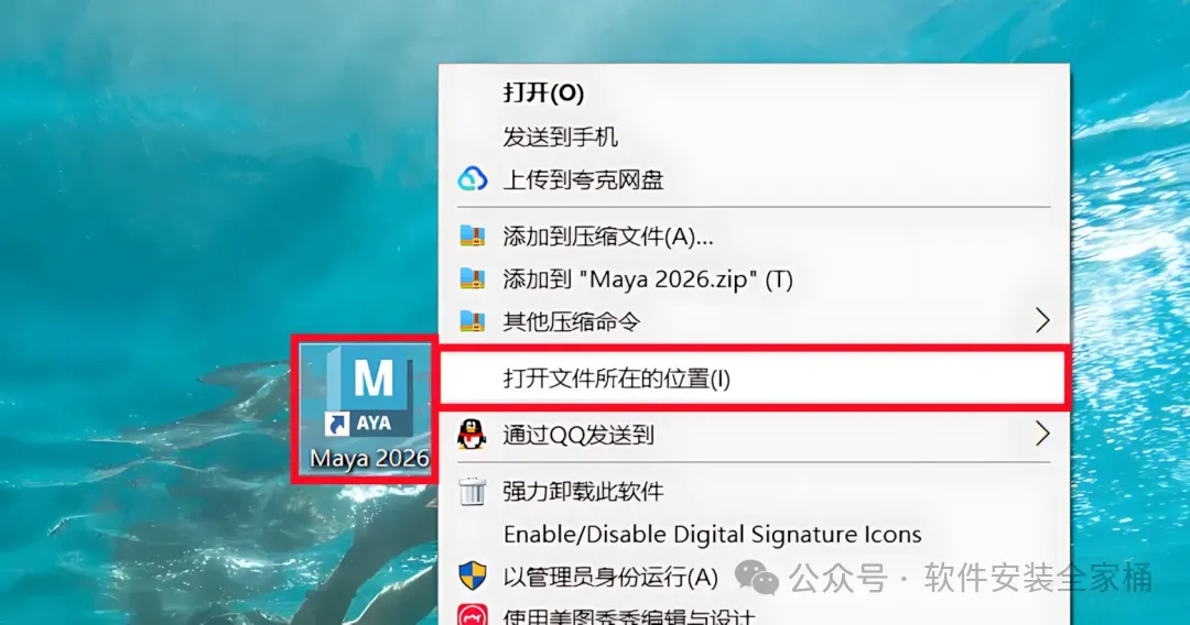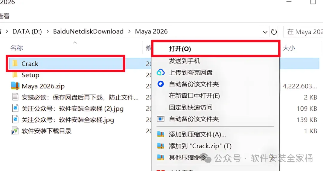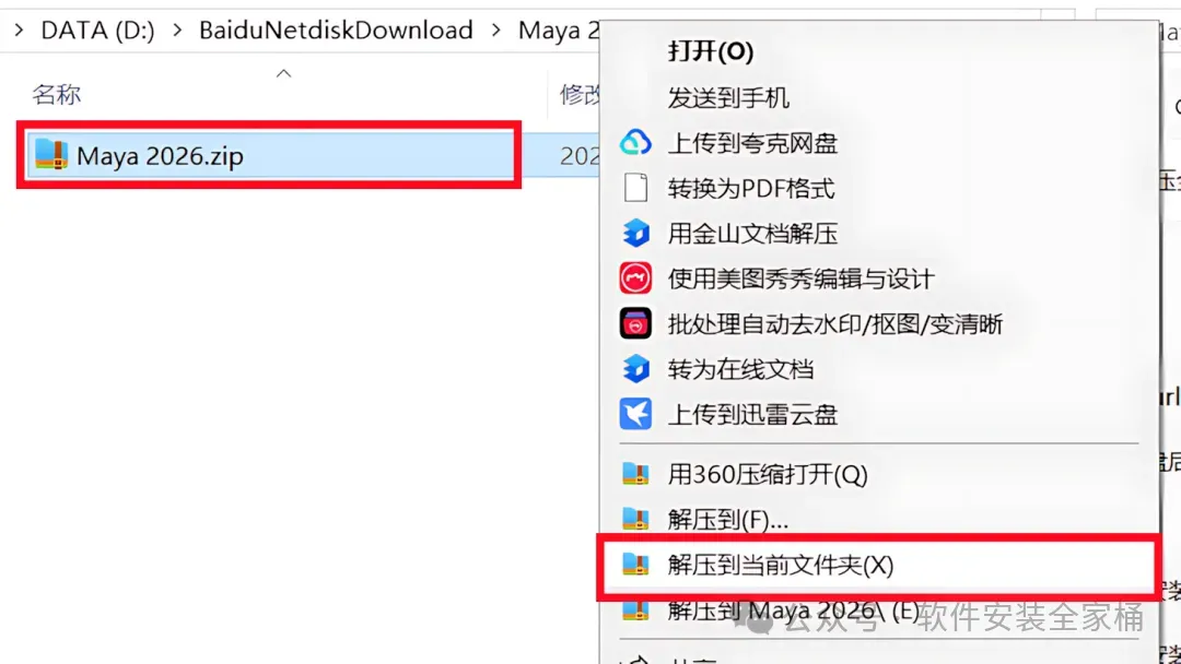 1.打开下载的Maya2026软件安装包,鼠标右击压缩包选择【解压到当前文件夹】。