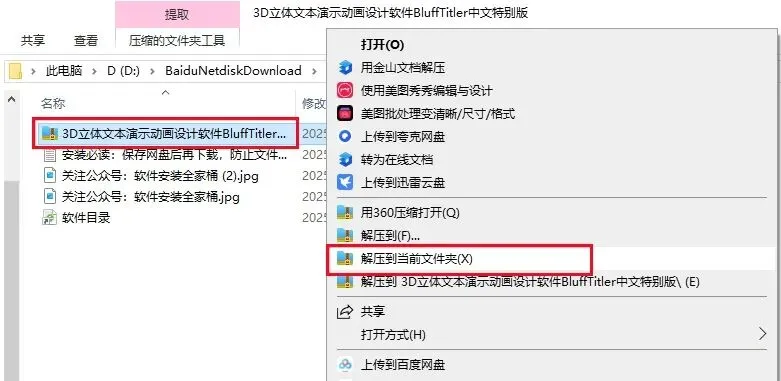 1、鼠标右击【3D立体文本演示动画设计软件BluffTitler】压缩包,选择【解压到当前文件夹】。