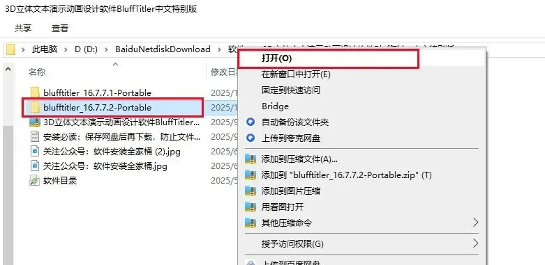 2、鼠标右击解压的【BluffTitler_16.7.7.2】文件夹,选择【打开】。