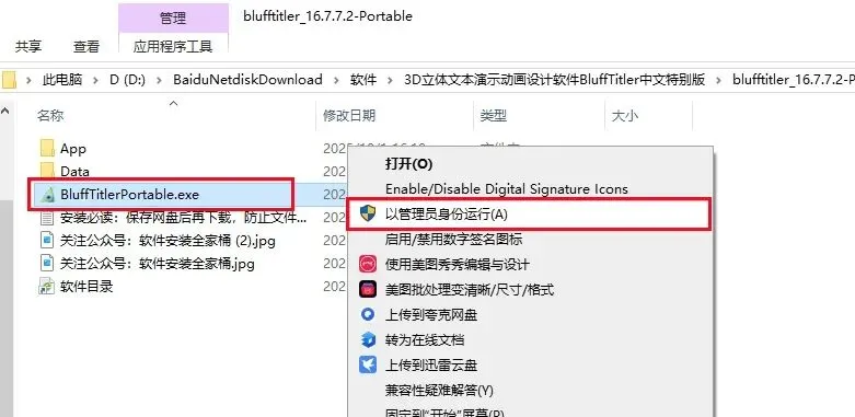 3、右击【BluffTitlerPortable】安装程序,选择【以管理员身份运行】。