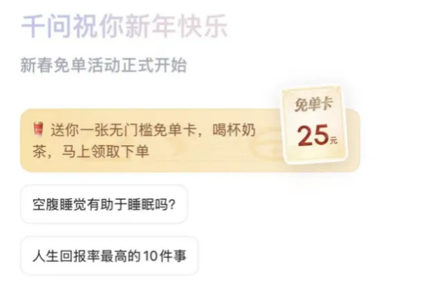 活动上线初期,在千问App获得25元免单卡后,点击“去下单”,千问App界面会自动输出“千问,帮我点杯奶茶”,并且,每位用户最多可在“千问春节免单活动”中获得21张25元免单卡,其中1张为无门槛免单卡,登录即有,另外20张为成功邀请新用户后获得,总计价值525元。