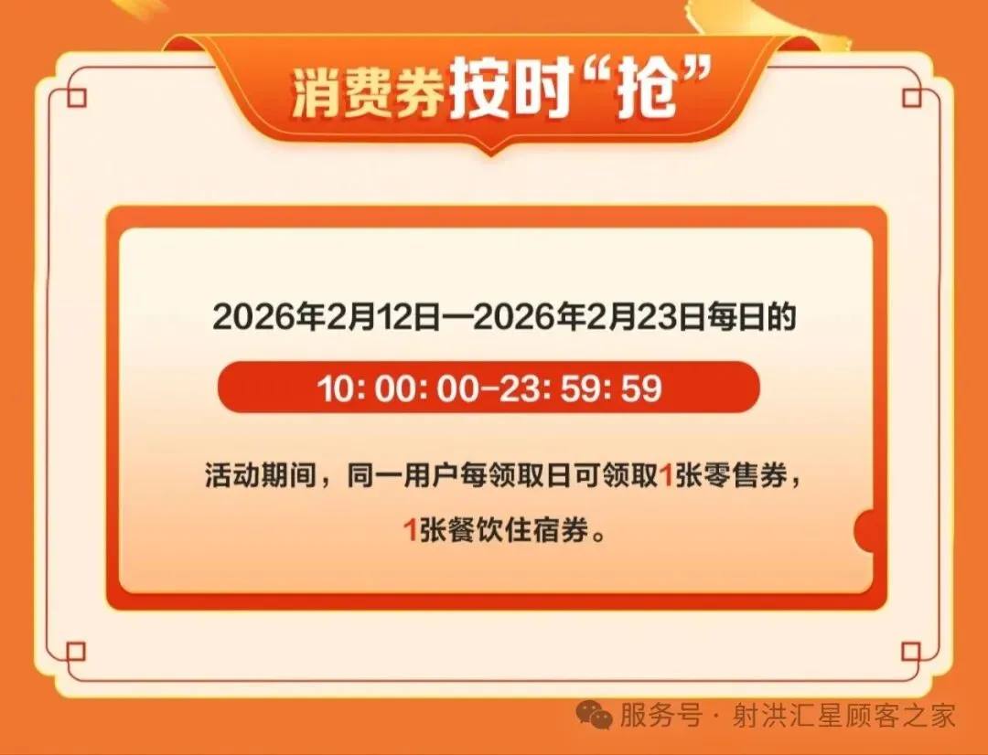 2026年2月12日至2月23日期间每日,发放零售券和餐饮住宿券。