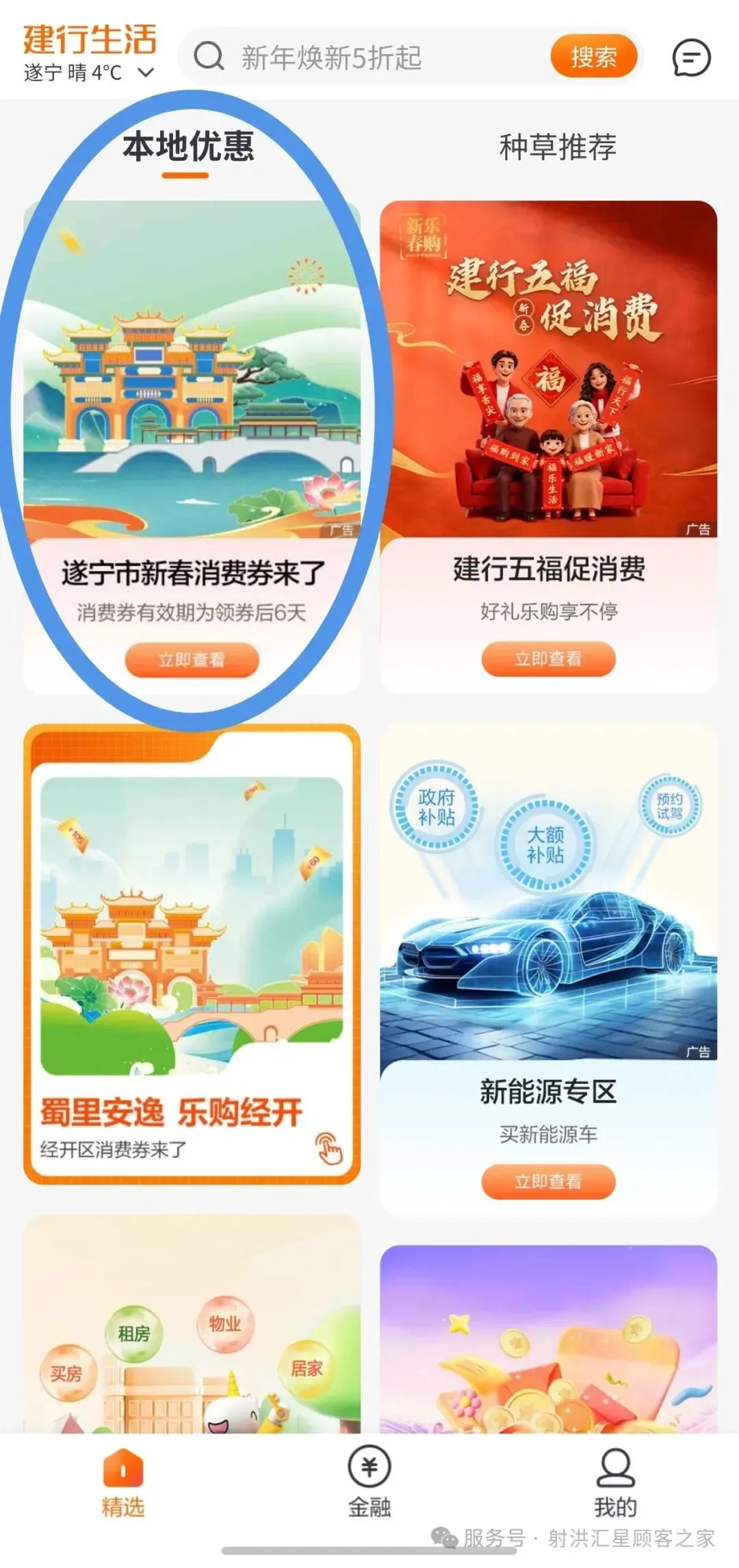 抢券指南:打开建行生活app-在本地优惠里-点击遂宁市新春消费券-即可抢-汇星电器/百货/超市6店/5楼幸福大食堂均可使用!