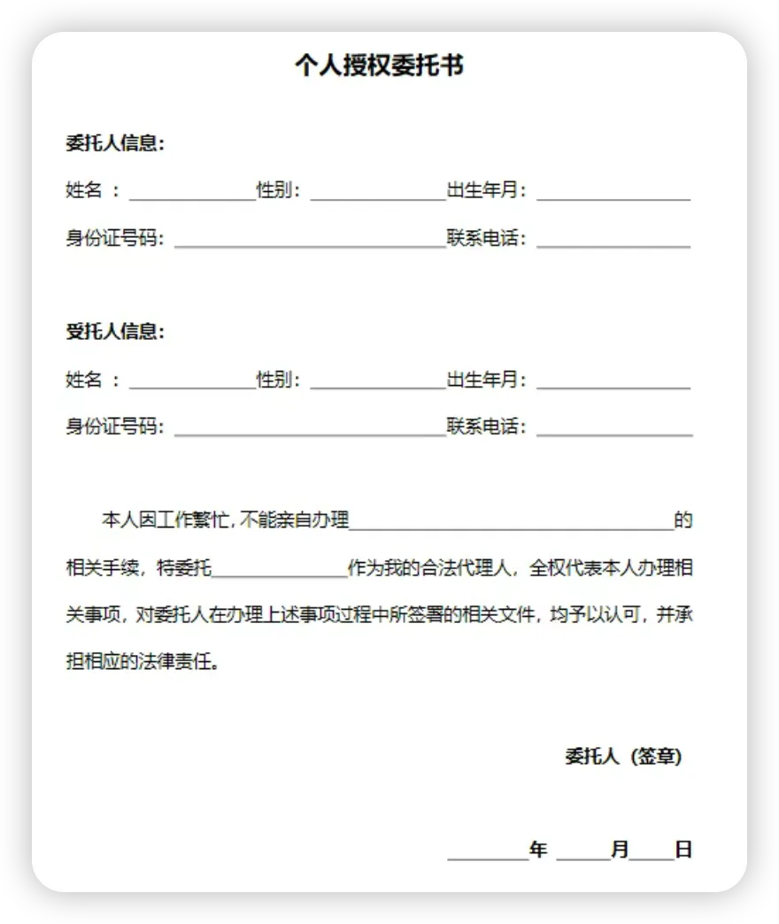 针对常见的个人代办需求,特别整理了个人委托书范本。无论是处理房产事务、车辆代办还是其他行政报备,都能找到对应的逻辑框架进行参考,让整个授权过程更省时。