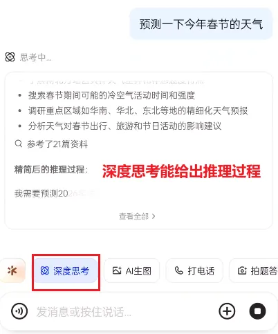 在遇到对问题不满意的时候可以点“深度思考”功能,它能让AI的推理能力进一步增强,可以进行多步推理,提升复杂任务的准确性,减少“直觉式错误”(直观的展示解答思路),生成更严谨、解构化的回答。