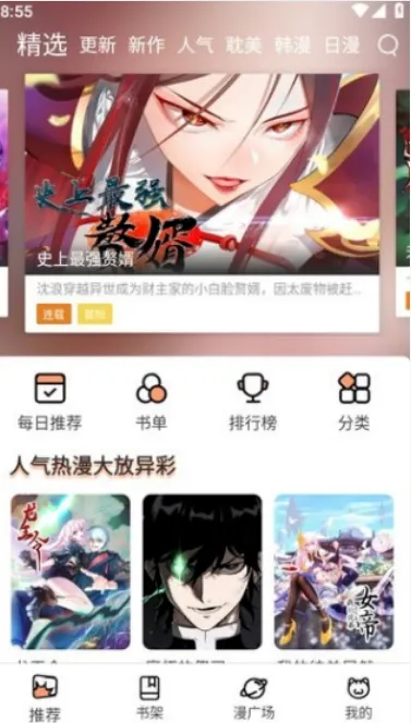 打开软件,可以看见有着各类漫画推荐,支持查看排行榜,各类热门漫画任你选择,返回点击分类,可以看见对漫画做了各种细致的分类,如科幻、剧情和搞笑等等,漫画应有尽有。