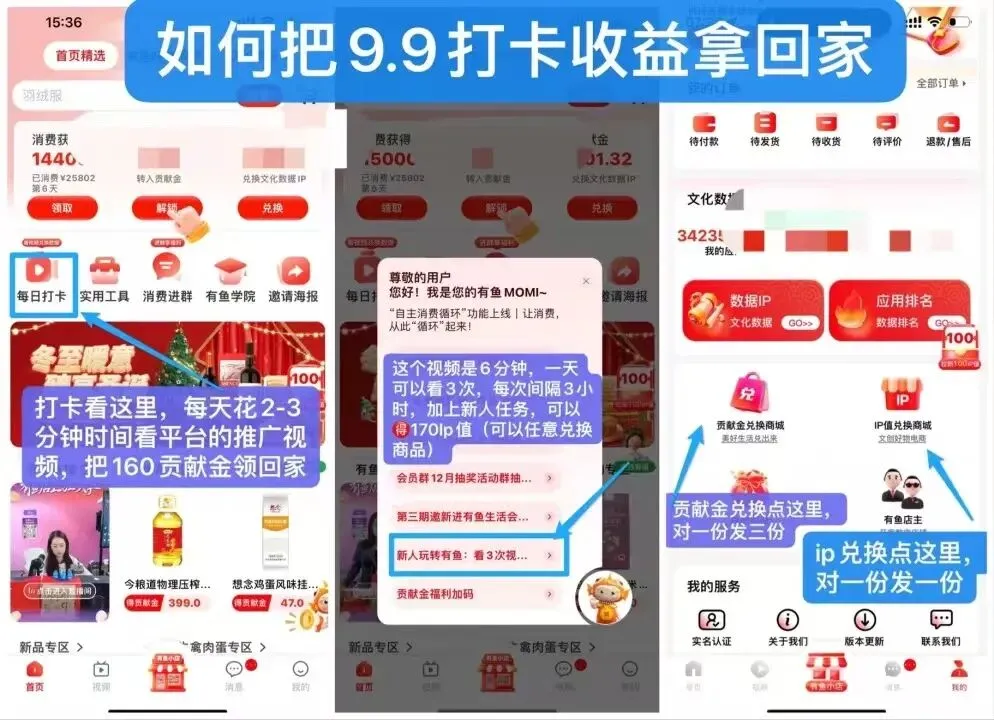 有鱼生活重构消费逻辑,让用户从“单纯花钱”变成“边花边省、边用边赚”。平台独创贡献金体系+消费补贴+广告分佣模式,消费、打卡、互动、分享均可获得贡献金,可兑换商品、文化数据IP,进而解锁核销补贴,实现消费回本、额外增收。