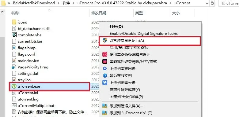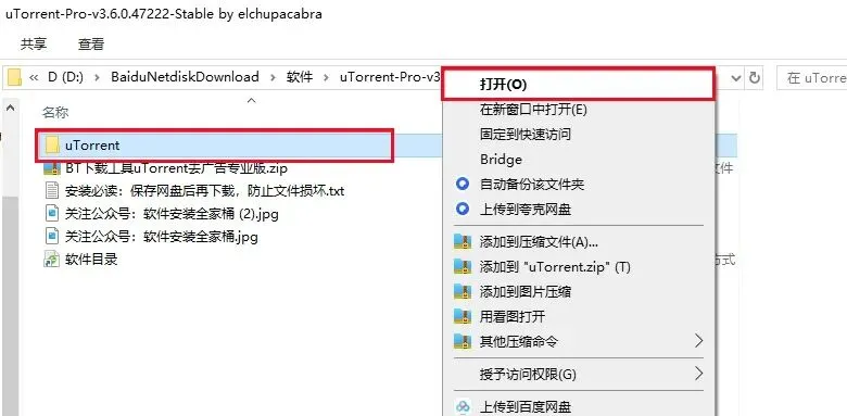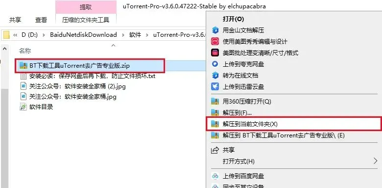 1、打开下载好的【BT下载工具μTorrent去广告专业版】压缩包,鼠标右击选择【解压到当前文件夹】。
