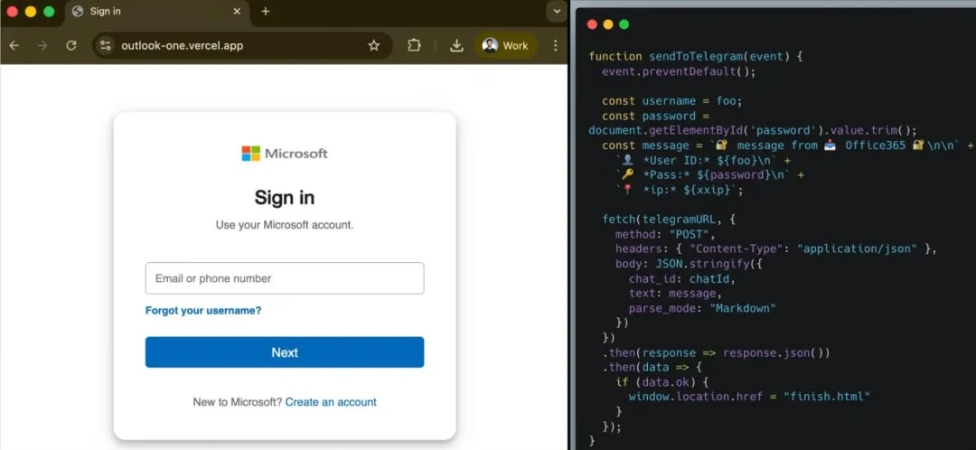 用户打开该插件时会看到仿官方的微软登录界面,输入的账户密码、信用卡号、银行安全答案等信息会通过 Telegram 机器人 API 被窃取,受害者随后会被重定向至真实登录页以降低怀疑,且该插件仍保留读写用户邮件的权限,所幸暂未发现相关滥用行为。Koi Security 溯源后发现超 4000 个账户信息被盗,且攻击者还在测试被盗凭证,同时该攻击者还运营着十余个针对银行、互联网服务商等的钓鱼工具包。