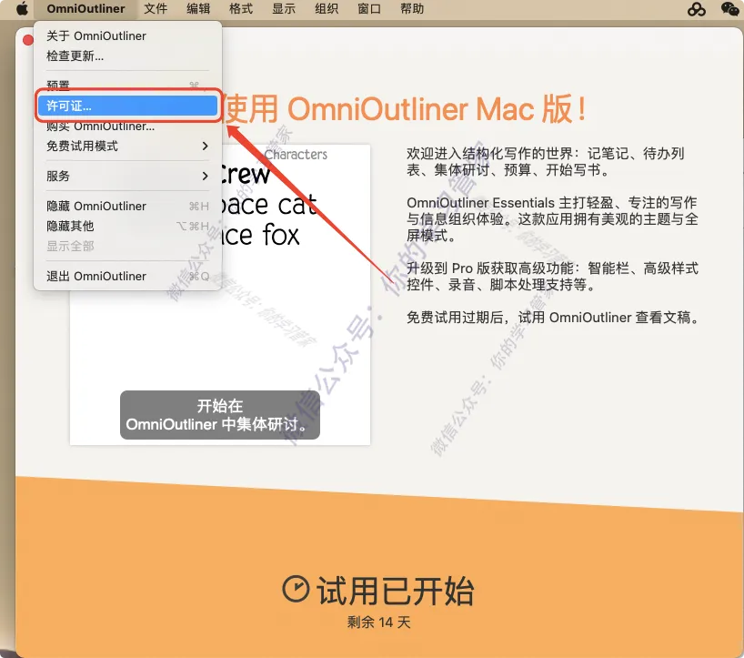 8、在左上角的菜单栏点击【OmniOutliner】,然后选择【许可证…】;