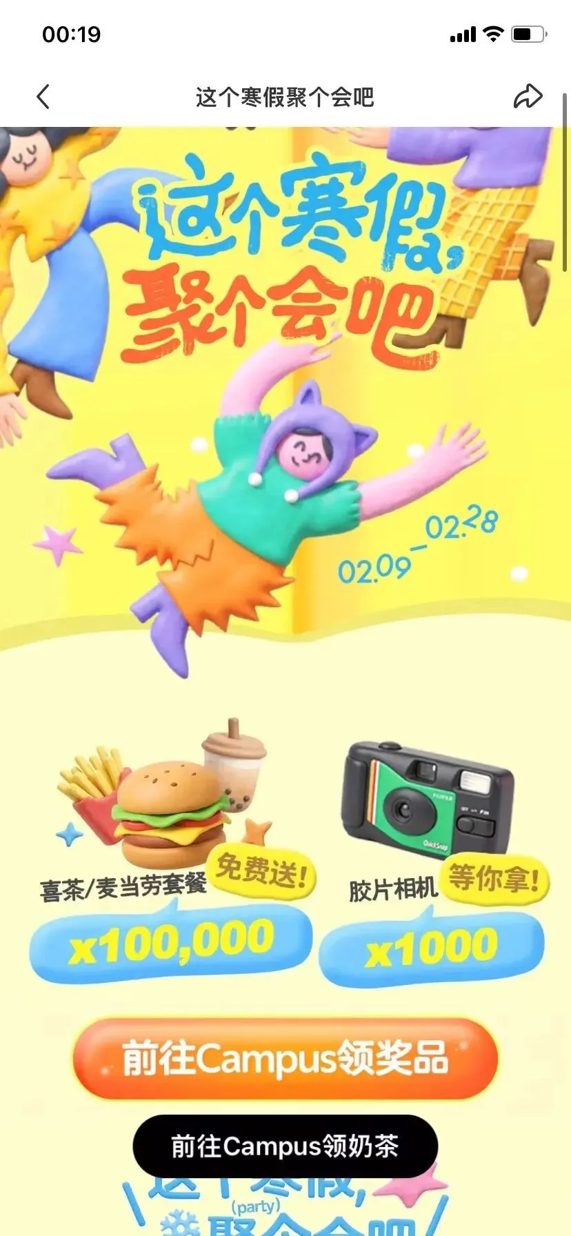 千问帮我们省下学习成本,Campus 则帮我们提升校园生活质量。现在,这款只属于大学生的 App 拉新活动正在火热进行,奶茶和汉堡券数量有限,先到先得,领完即止!
