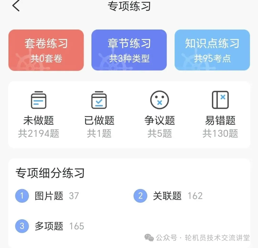 这是题数最多的一科,海事局第二版公开题库一共为3841道题,而且不是简单背诵就可以记住的。这其中包括电气、自动化的操作和管理以及故障诊断,个人觉得还是比较难的。这科我花费的时间最多,刷了3遍,专项题做了5遍,因为最后没有多少时间了,只刷了一遍的冲刺题(冲刺题),最后考的分数最低。记住千万不要只记选项,,海事局考试顺序是随机打乱的,你只记选项到时候你就吃亏了,第三遍开始选择选项随机打乱的方式刷题,这样考试的时候不会自乱阵脚。多家软件对比动装这一科船员易考通原题是最多的,我应该把重点放在冲刺题上,同样现在因为上了通关题库,还是建议大家直接刷2025新版通关题库即可!