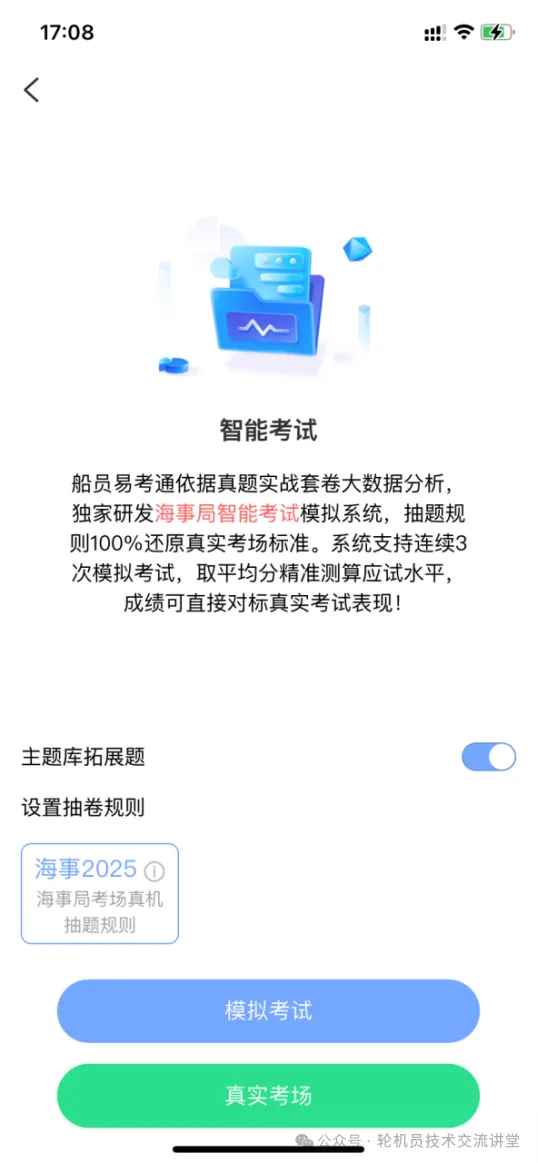 它里面还有一个真实考场模拟的模式,非常牛,就是模拟海事局考试的选题模式来选题的,比较综合平均,各个知识点都涵盖了!易综合的模拟考试是你最近主要看哪些题,模拟考试就多抽这些你练过的题型,这样会导致你平时模拟的分数很高,考试的时候分数不高。