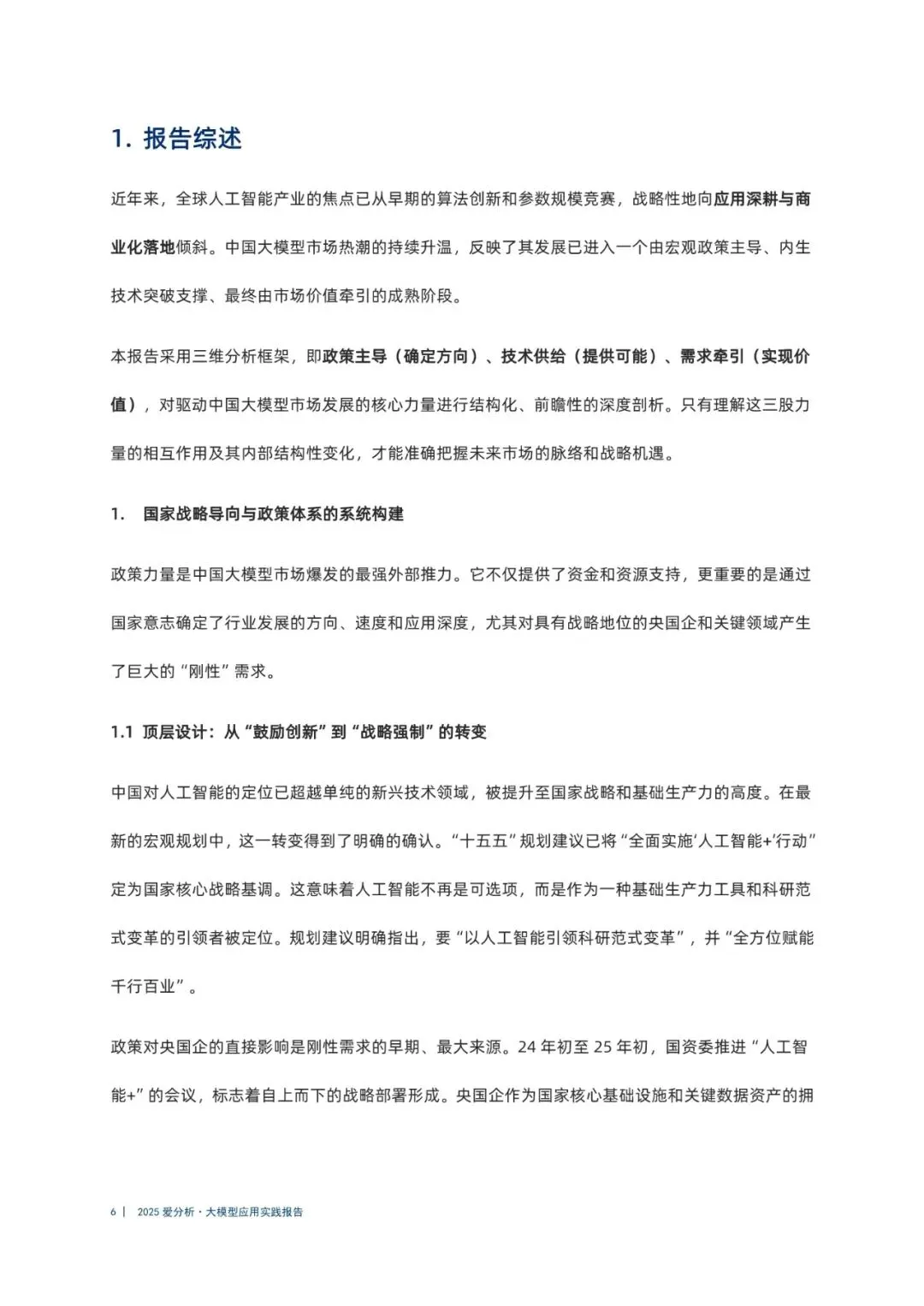 本报告采用三维分析框架,即政策主导(确定方向)、技术供给(提供可能)、需求牵引(实现价值),对驱动中国大模型市场发展的核心力量进行结构化、前瞻性的深度剖析。只有理解这三股力量的相互作用及其内部结构性变化,才能准确把握未来市场的脉络和战略机遇。
