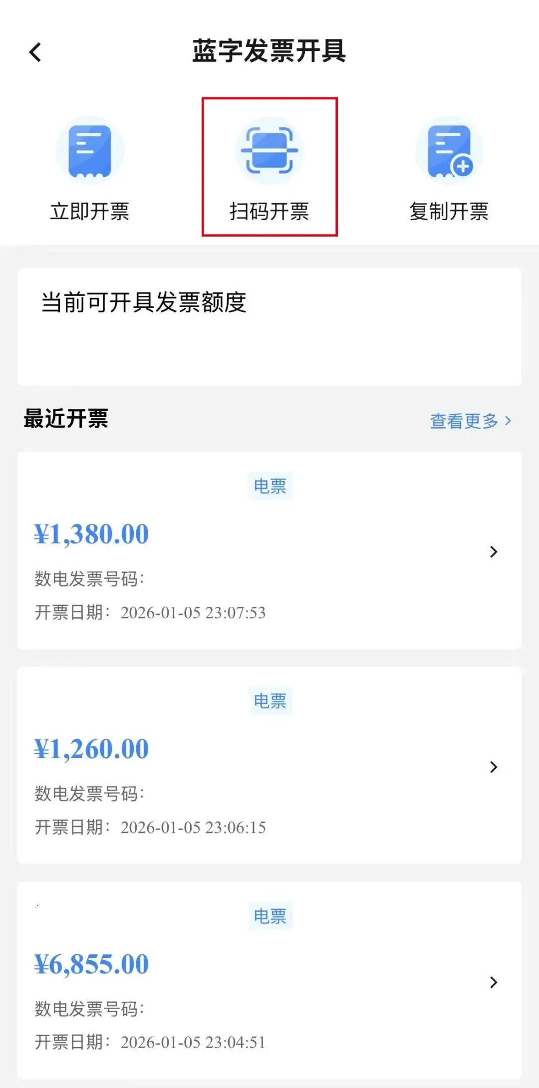 在电子税务局APP蓝字发票开具功能页面,点击【扫码开票】