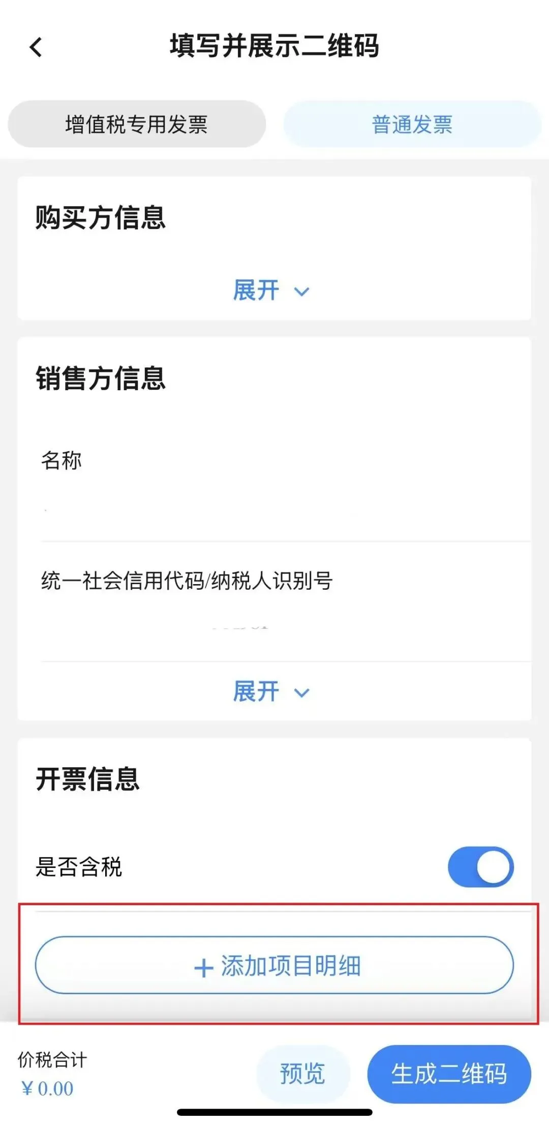 在扫码开票界面选择交易信息二维码,点击填写并展示二维码