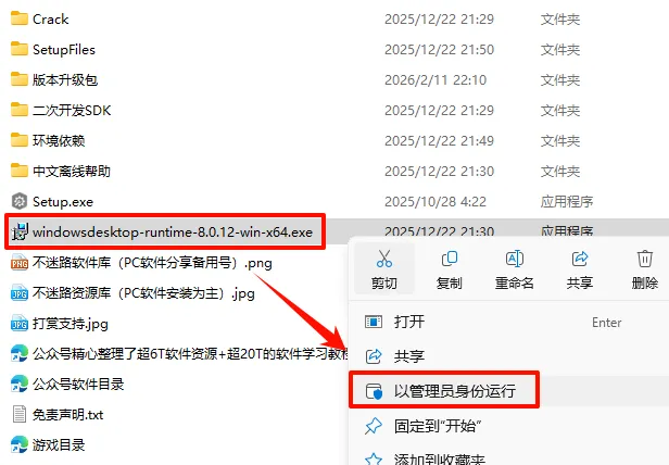 2.打开刚刚解压的文件夹,鼠标右键点击“windowsdesktop-runtime-8.0.12-win-x64.exe”选择“以管理员身份运行”
