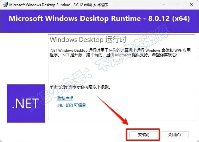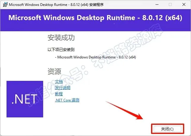 4.点击“关闭”(如果系统安装了windowsdesktop-runtime-8.0.12运行组件,请直接跳到第5步)