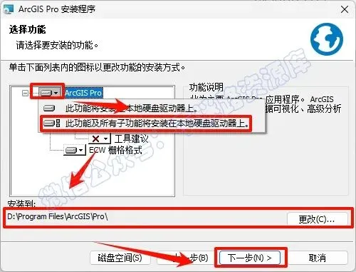 10.点击“倒三角展开符“,选择“此功能及所有子功能将安装到本地硬盘驱动器上“,选择软件安装路径,建议和教程中的保持一致,本例安装到D盘(将路径地址中的首字符C改为D表示安装到D盘,安装路径不要出现中文),点击“下一步”