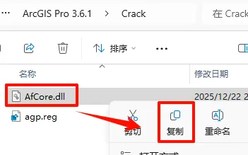18.返回”Crack“文件夹,选中“AfCore.dll”文件,鼠标右键点击“复制”