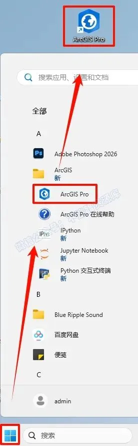19.点击“开始“菜单栏,找到“ArcGIS Pro“软件,鼠标左键拖拽到桌面上即可创建桌面快捷方式