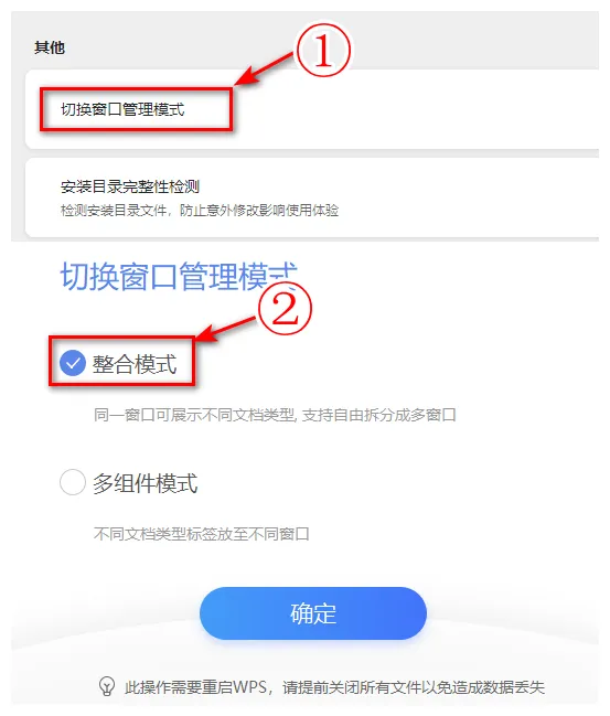 2、下载安装后,任意打开一个WPS文档,找到左上角的“首页”图标,点击右上角的“全局设置”→“设置”,进入“设置中心”,点击“其他”下的“切换窗口管理模式”,接下来,勾选“整合模式”并确定,重启WPS,设置生效。