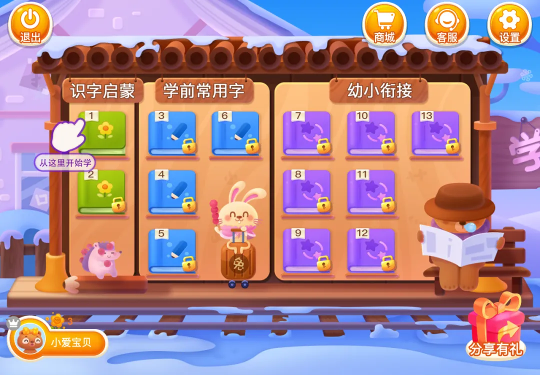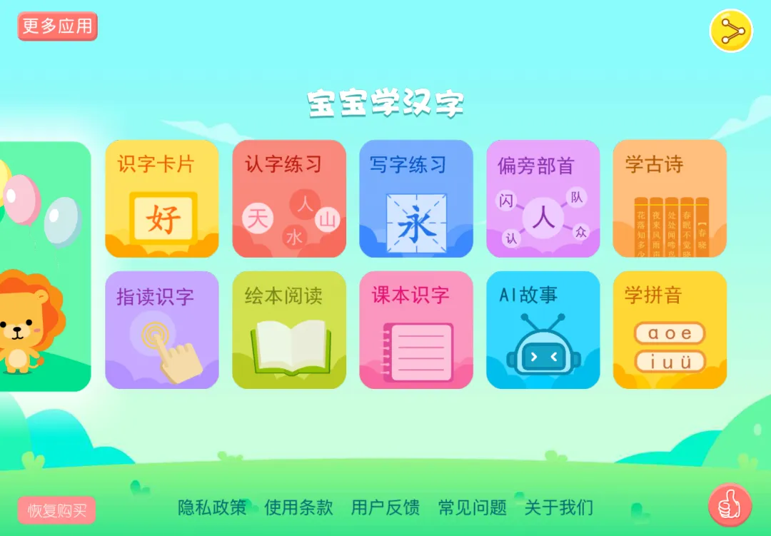 这款App和第一弹中的App相似,但是它的识字场景更贴近生活,小朋友们的参与度更高。另外注重组词,画面可爱,附带有拼音绘本等资源是其较为突出的优势。