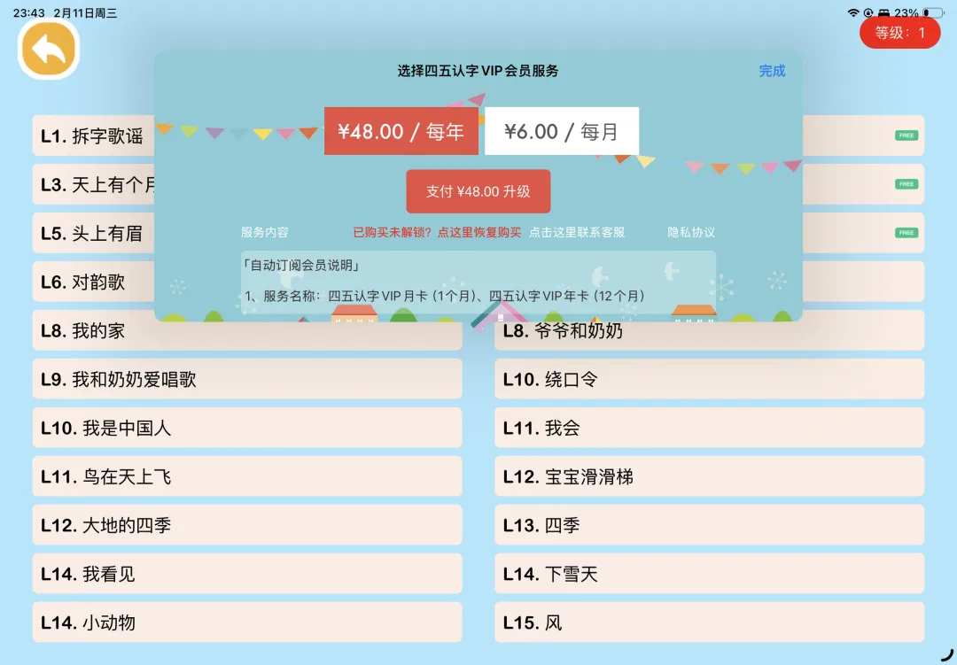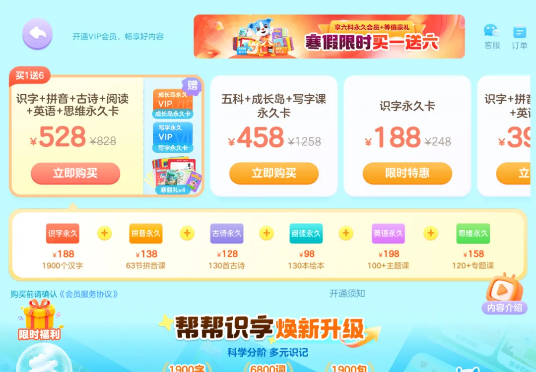 另外这款App是一个学龄前儿童启蒙“大集合”,除了识字的内容还有拼音、古诗、思维、英语的资源。老樵顺便浏览了古诗和英语内容,App都做到了分级闯关,由浅入深,符合孩子的认知规律。会员价格如下,所有内容都有免费试用资源。
