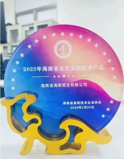 近日,在以“自贸港封关赋能 高新聚力领航”为主题的2026年海南省高新技术企业高质量发展年会上,金海浆纸旗下“亚光双面铜版纸GMH350”“双面铜版纸GAH350”及“龙头牌漂白阔叶木浆”三款浆纸产品,荣获2025年海南省名优高新技术产品认定,成为本届获奖数量最多的企业之一,彰显了金海浆纸在高新技术产业化道路上的深厚积淀与强劲实力,为海南高新技术产业作良好示范效应。