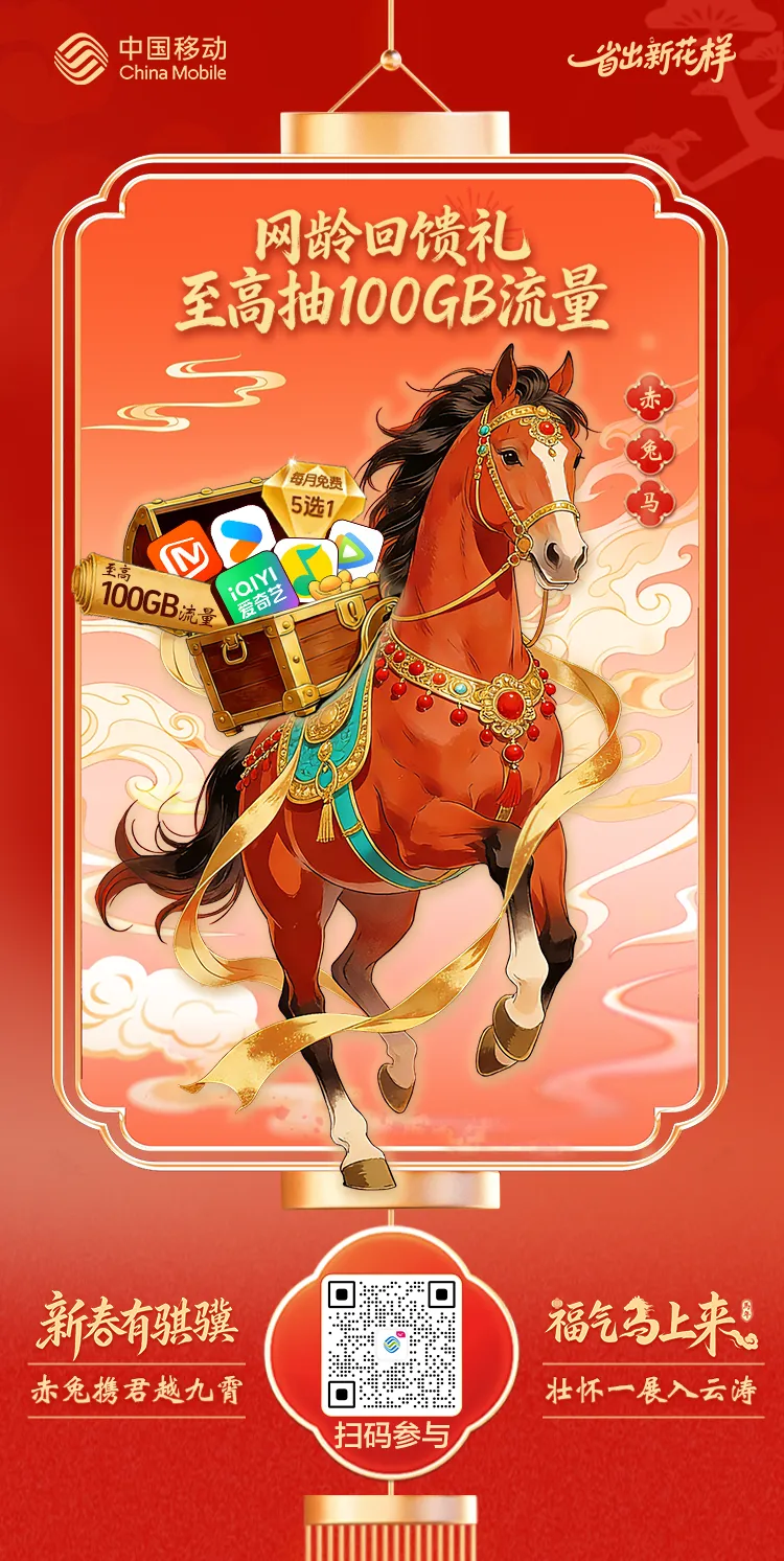新春宅家追春晚、走亲访友发拜年视频,最怕流量告急?别慌!新春有骐骥,福气马上来!进入中国移动APP搜索“网龄回馈礼”,多重流量、权益好礼已备好,为新年加满福气,帮你轻松告别流量使用焦虑!