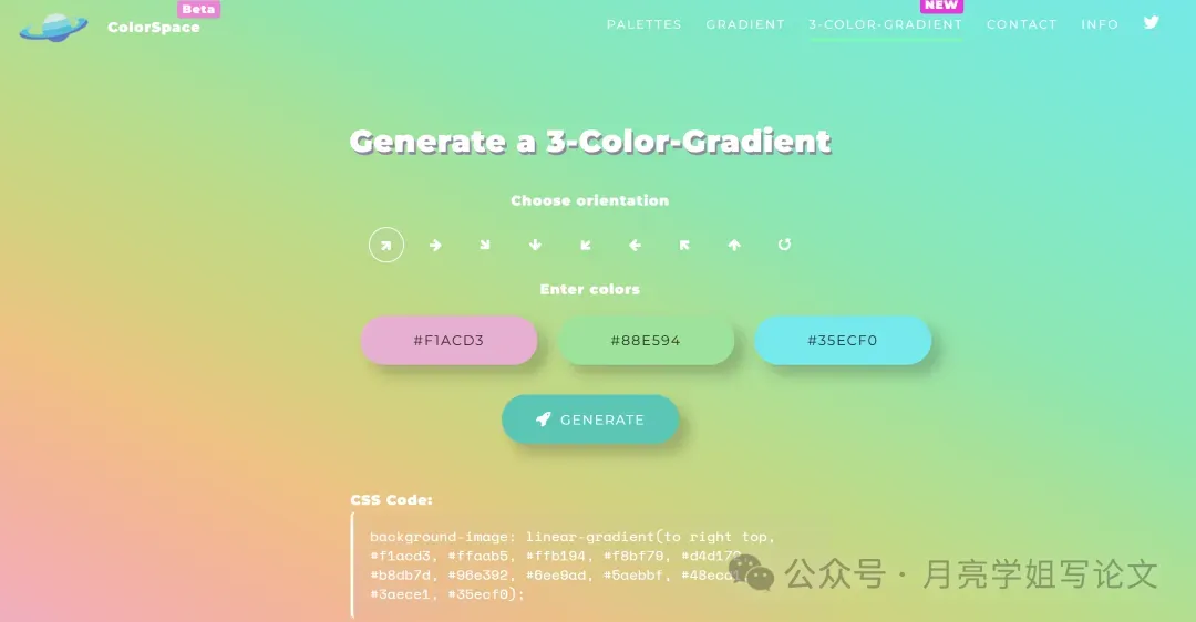 ②渐变配色生成器:ColorSpace提供渐变色和三色渐变这两种配色模式,科研人员只需选择色块,再点击“CENERATE”,即可生成渐变色。