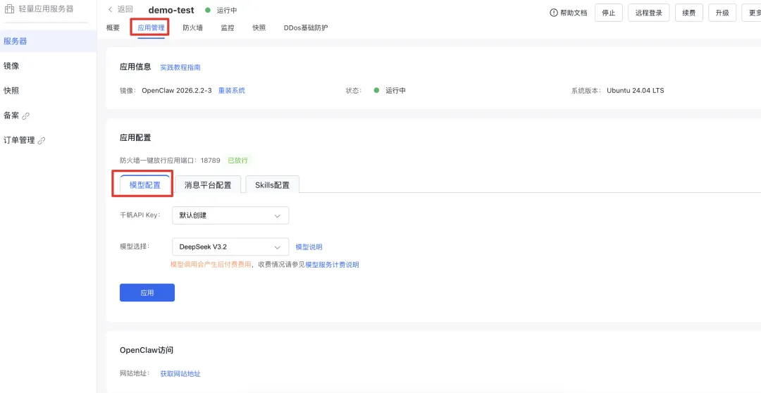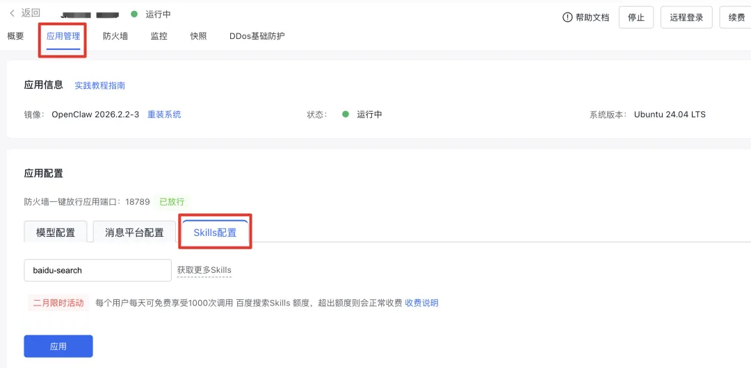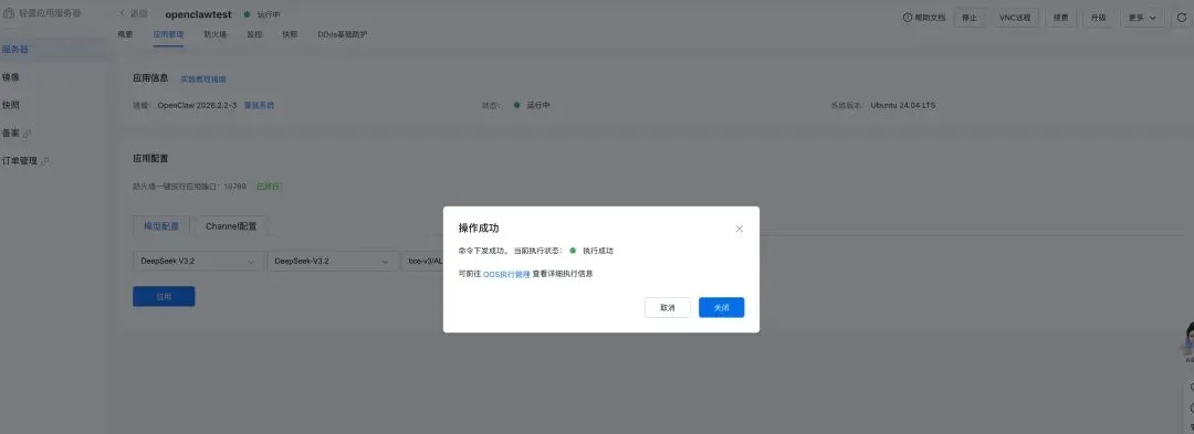等待实例创建完成后进入实例详情页,点击实例管理Tab,应用配置需要您开通千帆大模型、云助手、运维编排OOS产品服务。