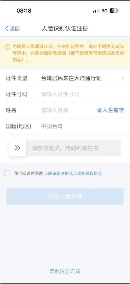 点击“人脸识别认证注册”,系统自动弹出自然人电子税务局用户注册协议对话框,点击“同意”按钮,进入“人脸识别认证注册”页面。在证件类型中选择台湾居民来往大陆通行证或者中华人民共和国台湾居民居住证,填写证件号码、姓名,按住滑块,拖动到最右边,勾选“我已阅读并同意人脸识别注册认证功能授权协议”,点击“开始人脸识别”按钮,人脸识别完成后,进入“用户注册”页面。填写密码和手机号码,输入短信验证码,注册即完成。