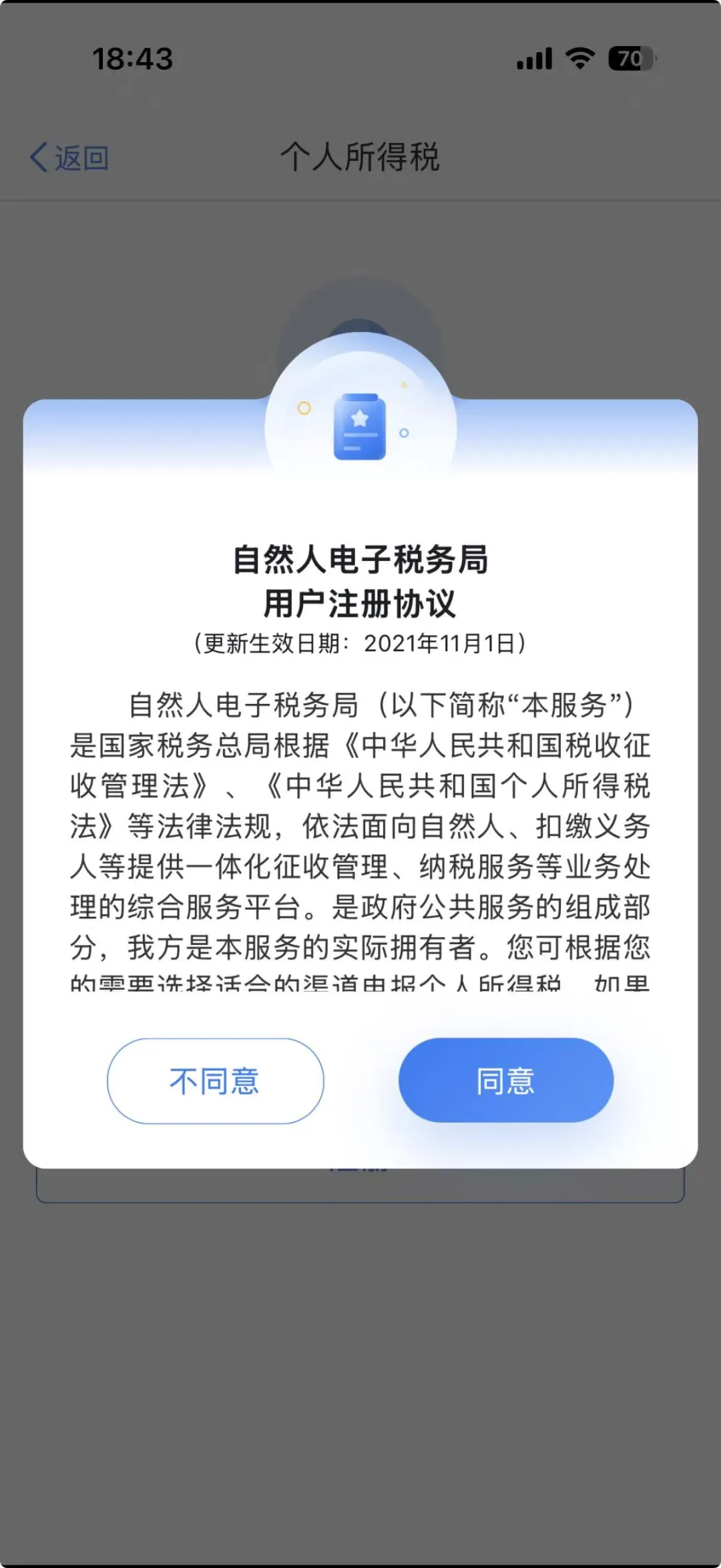 下载安装完成后打开“个人所得税”APP,系统自动弹出自然人电子税务局个人信息及隐私保护政策对话框,点击“同意”按钮。