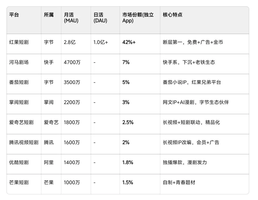 红果短剧已经是绝对是国内短剧第一、现象级爆火。日活2026年1月破1亿,字节第五款亿级独立App;月活近3亿,超B站、优酷,在线视频赛道排第4;市场份额短剧赛道42%+,断层第一;用户日均使用2.01小时,碾压爱奇艺和腾讯视频;累计上线1.5万+部,月更1000+部;130+部播放破10亿;2025年全年收入超150亿元,知情人士称实际更高。