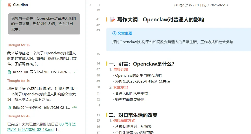 我想写一篇关于Openclaw对普通人影响的一篇文章,帮我列个大纲,插入到日记中。