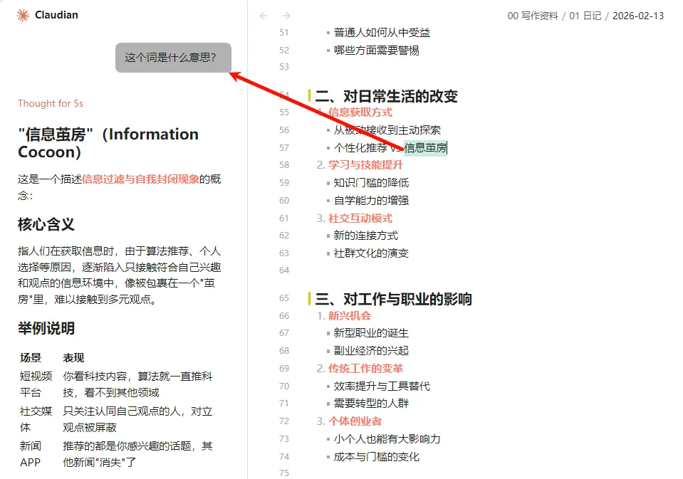 当你看到其中提到了信息茧房这个词,不知道是什么意思的时候,直接在右侧选中,在对话框中输入”这个词是什么意思?“