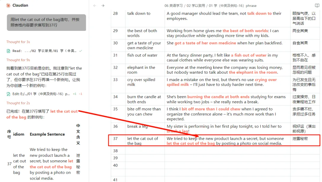 我的obsidian中有一个专门记录英文idiom的文档,以前当学到一个新的之后,是需要手动去找例句、粘贴的。
