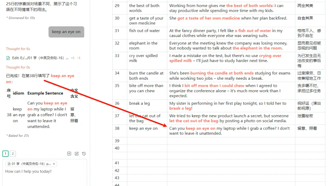 而又由于AI现在有上下文记忆功能,在之后的操作中甚至可以直接输入一个新的英文词组”keep an eye on”,就会按照之前的要求来执行操作。