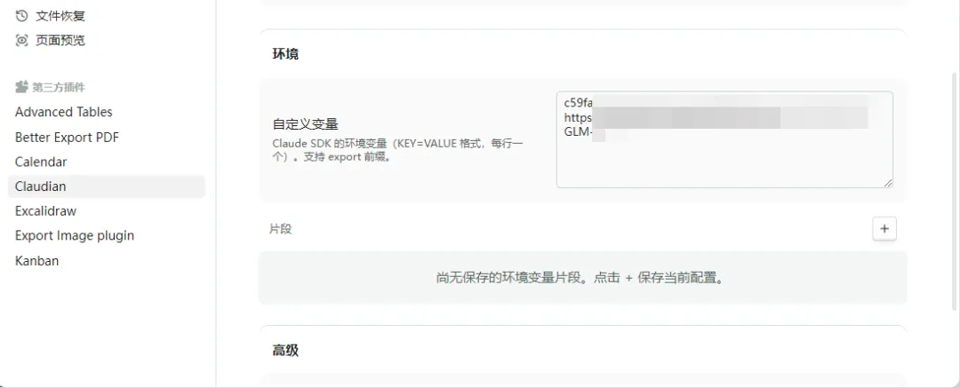 然后就是将自己的API输入配置,点击设置-第三方插件-Claudian中,向下拉到环境。 依次输入:API、对应地址、模型