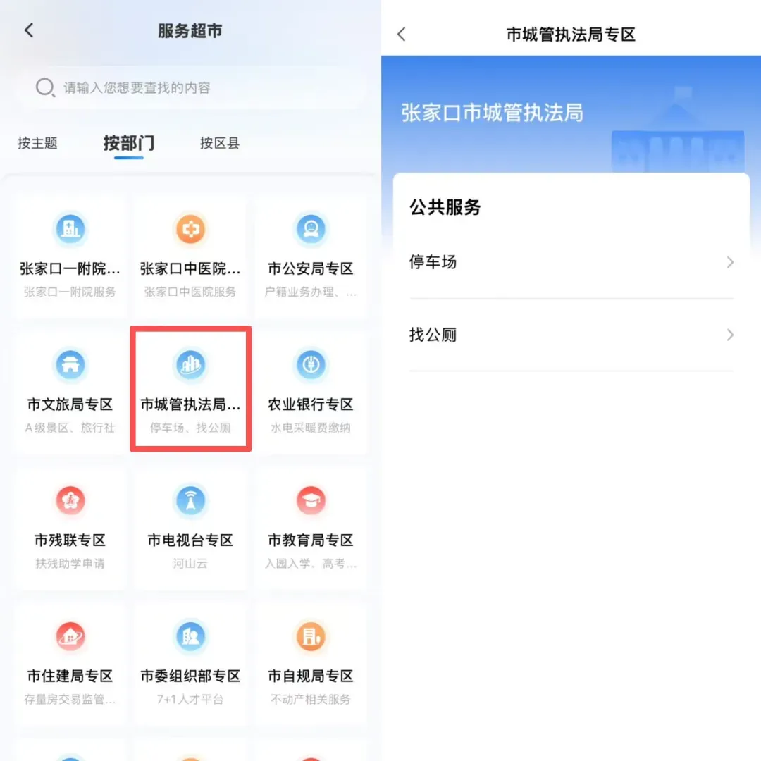 打开“幸福张家口”App → 进入首页【服务超市】→ 选择【按部门查找】 → 点击【市城管执法局】,即可使用“停车场查询”与“找公厕”两项便民工具。