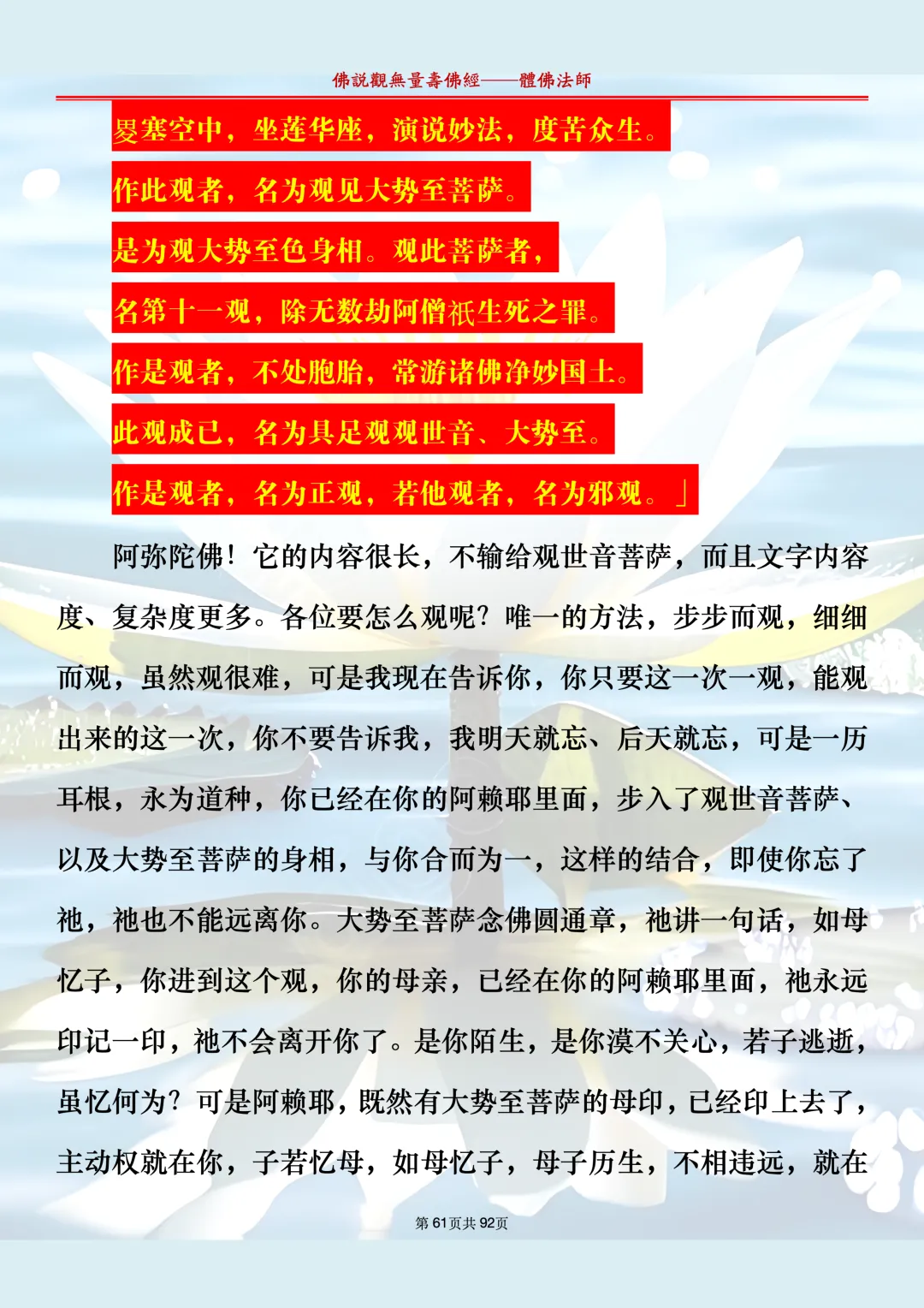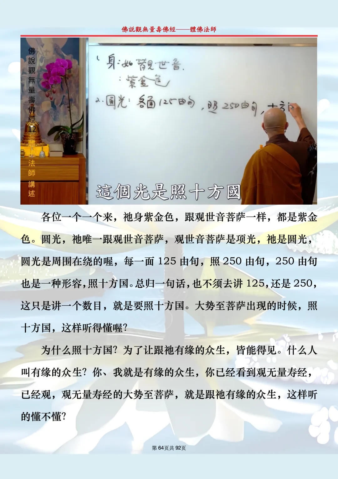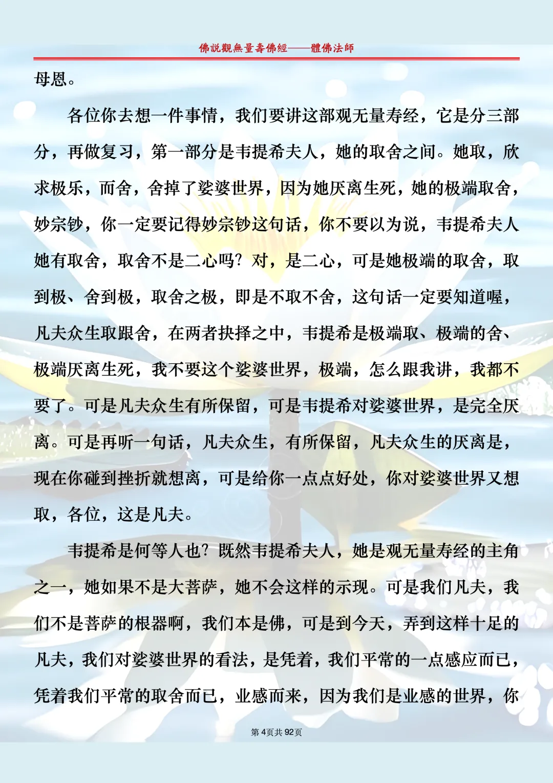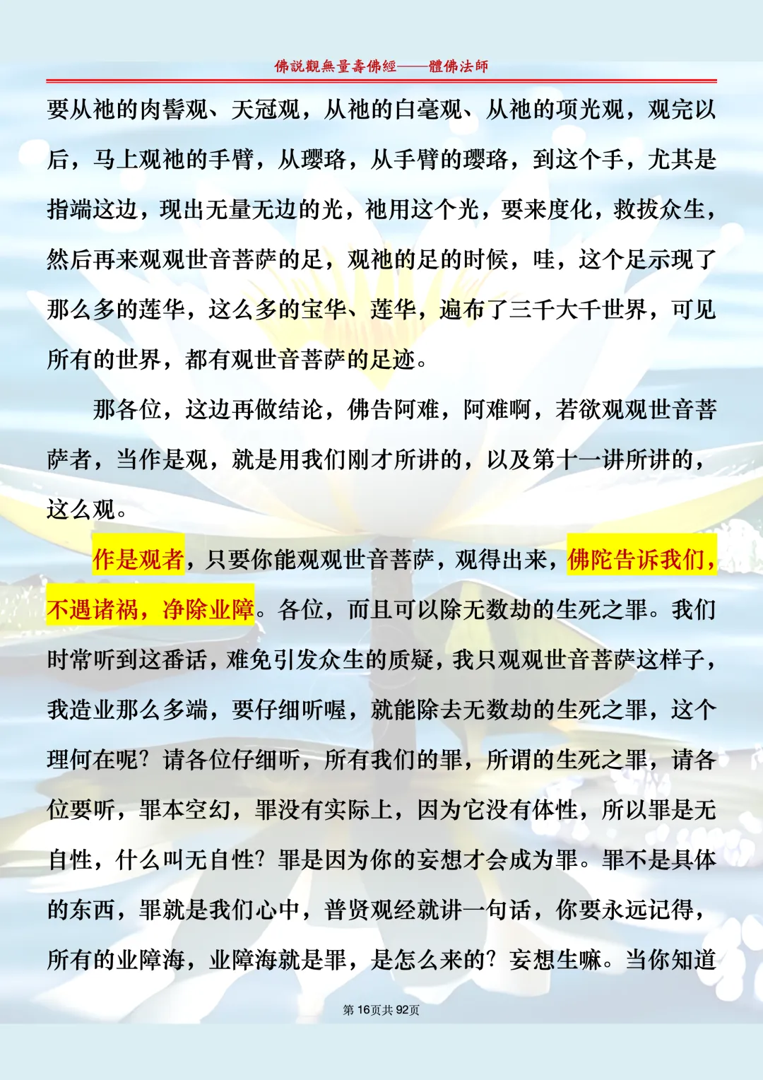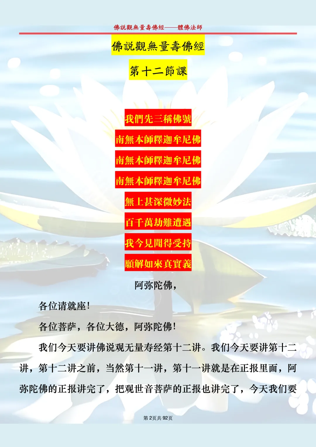 体佛法师讲解的《佛说观无量寿佛经》讲义,文字文档分享,是严格按照视频所讲,一句一句校对而整理,不出自任何团队,也不属于任何团队,也非视频转换软件提取的文字,所以文字准确率高。每一节课分成二段或者三段,依次分享。文字文档,是方便没有时间观看视频的情况下使用,非作他用,大家时间充裕的情况下,重点还是应以法师讲解的视频为主,文字是其次。