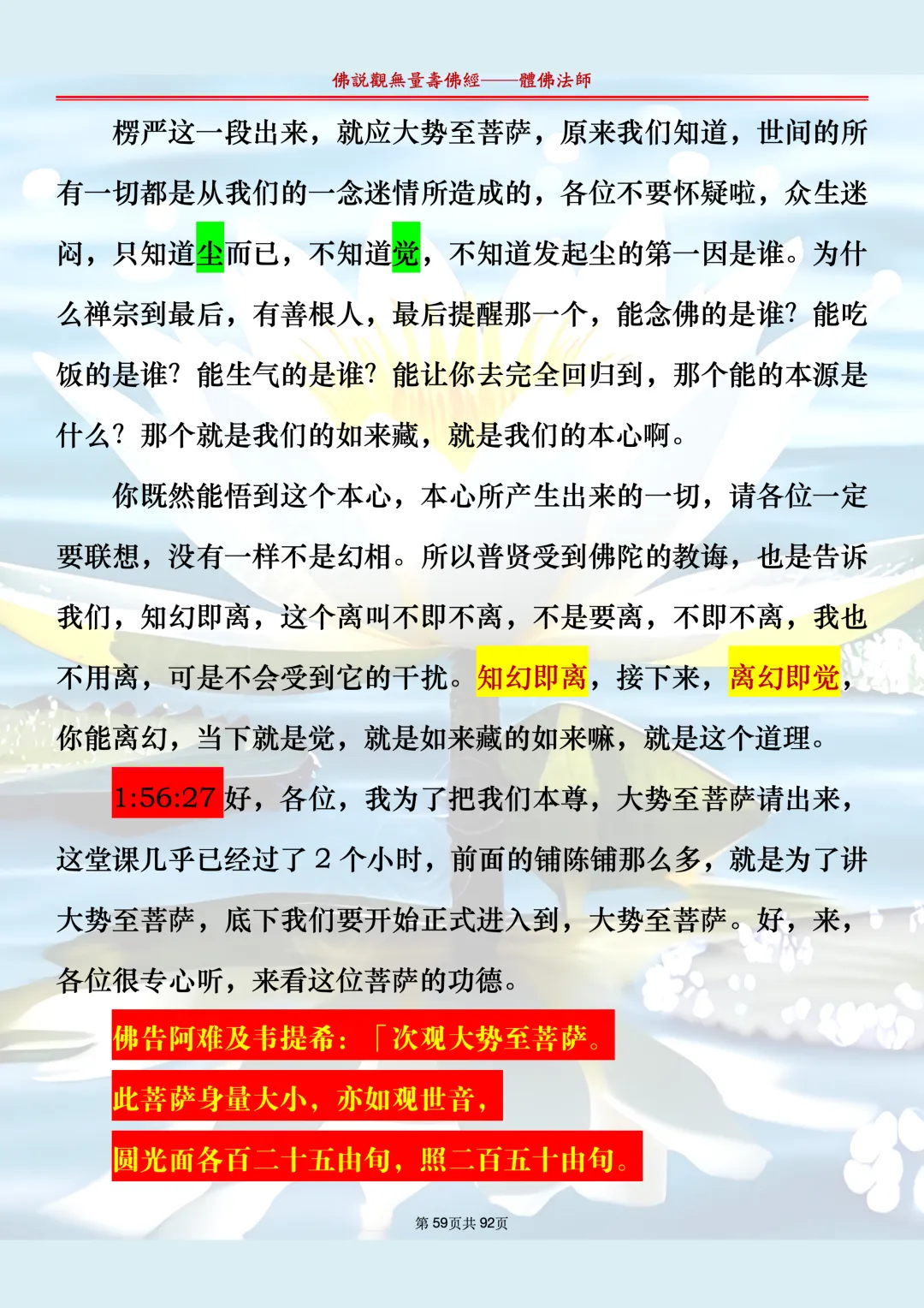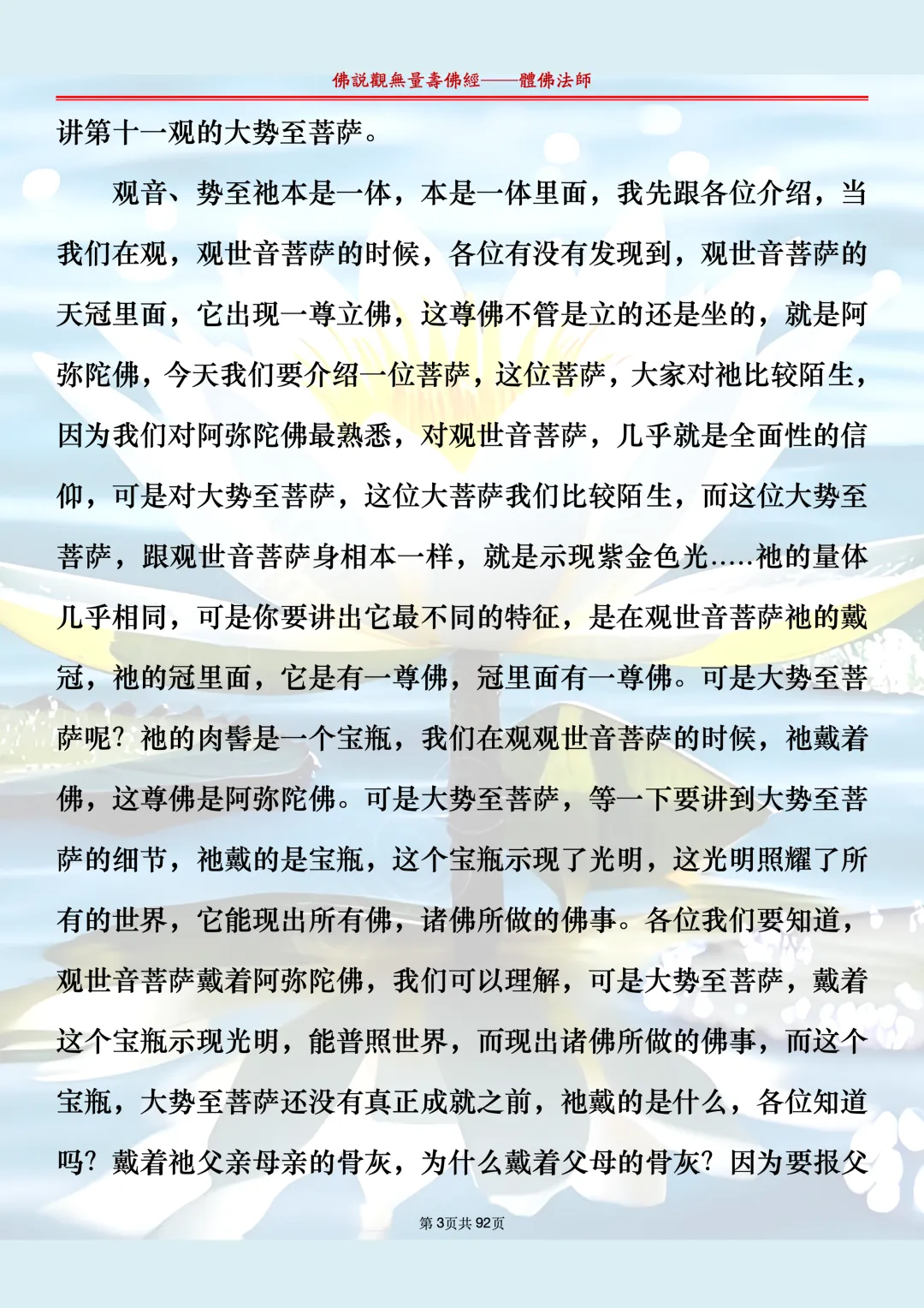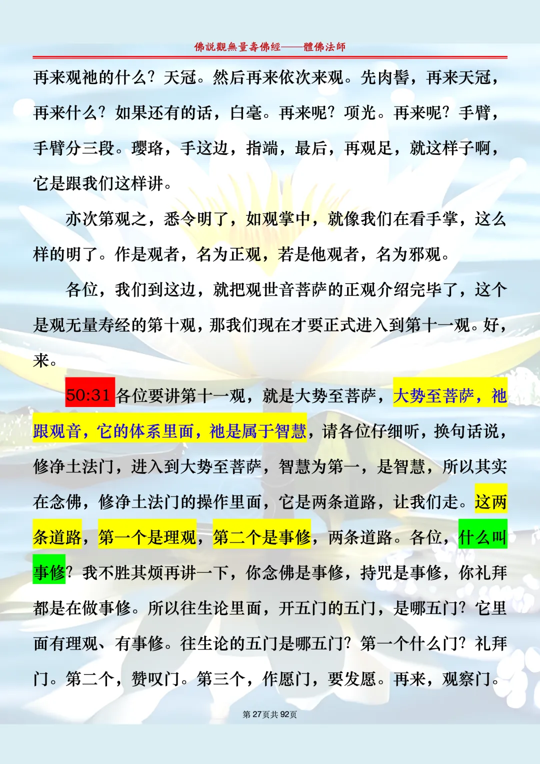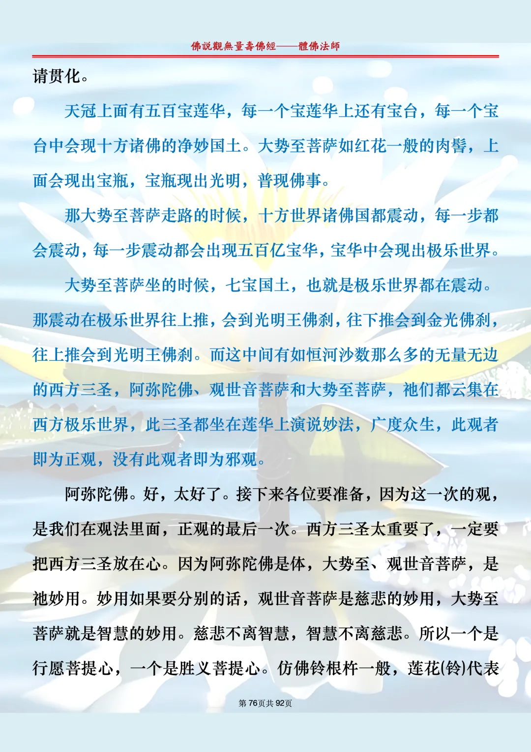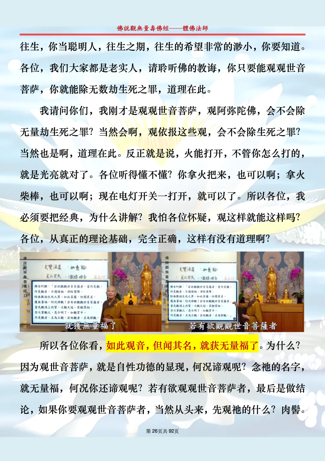 体佛法师讲解的《佛说观无量寿佛经》讲义,文字文档分享,是严格按照视频所讲,一句一句校对而整理,不出自任何团队,也不属于任何团队,也非视频转换软件提取的文字,所以文字准确率高。每一节课分成二段或者三段,依次分享。文字文档,是方便没有时间观看视频的情况下使用,非作他用,大家时间充裕的情况下,重点还是应以法师讲解的视频为主,文字是其次。
