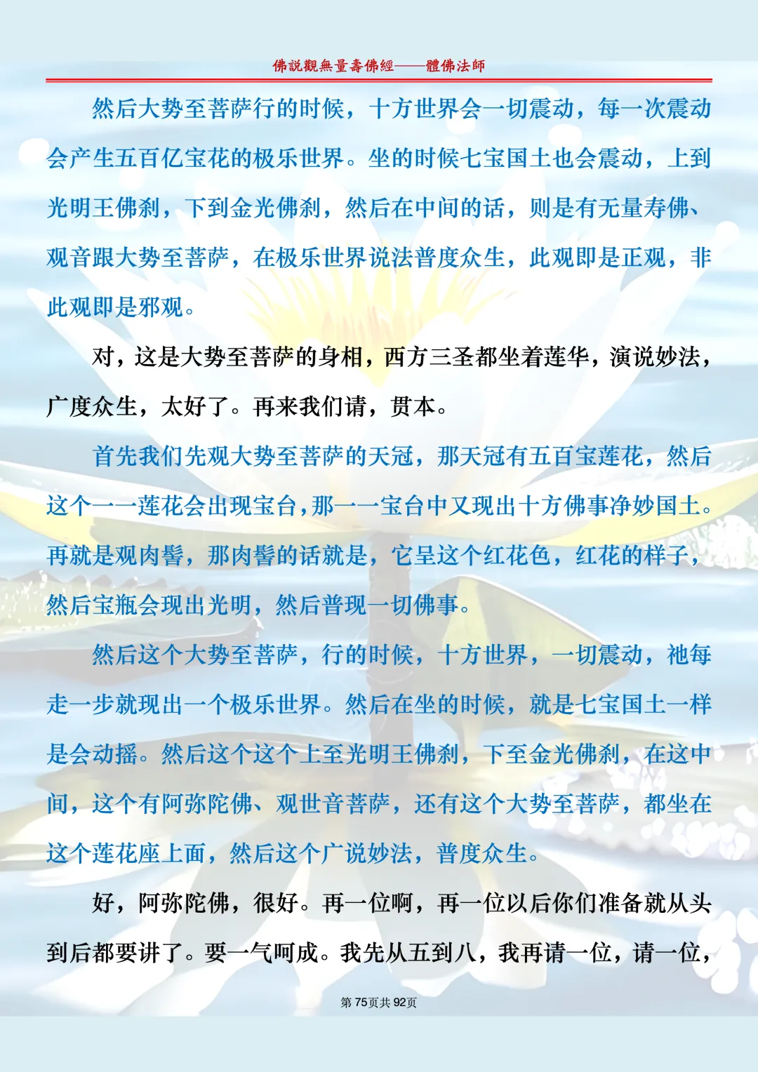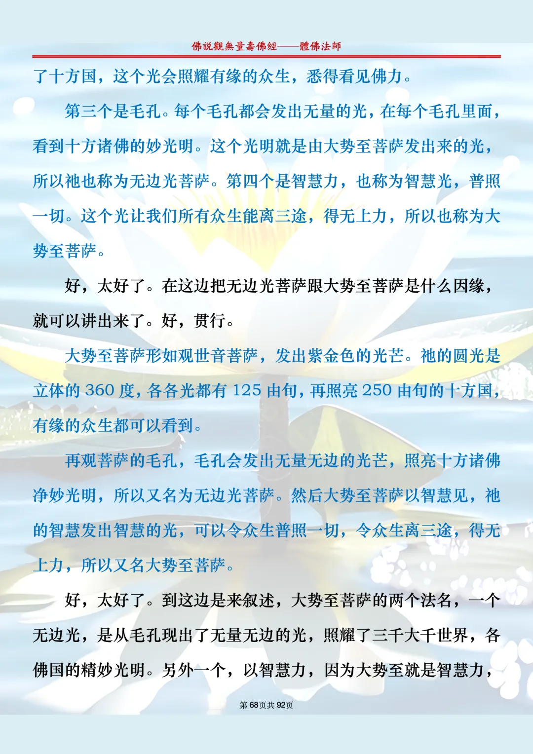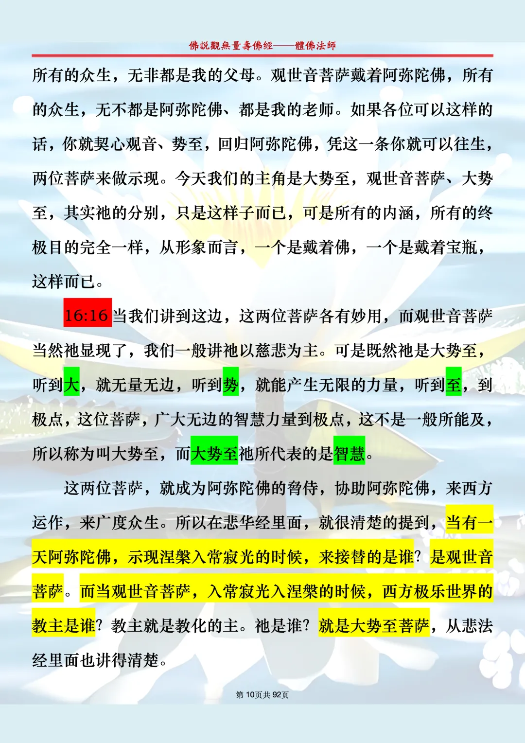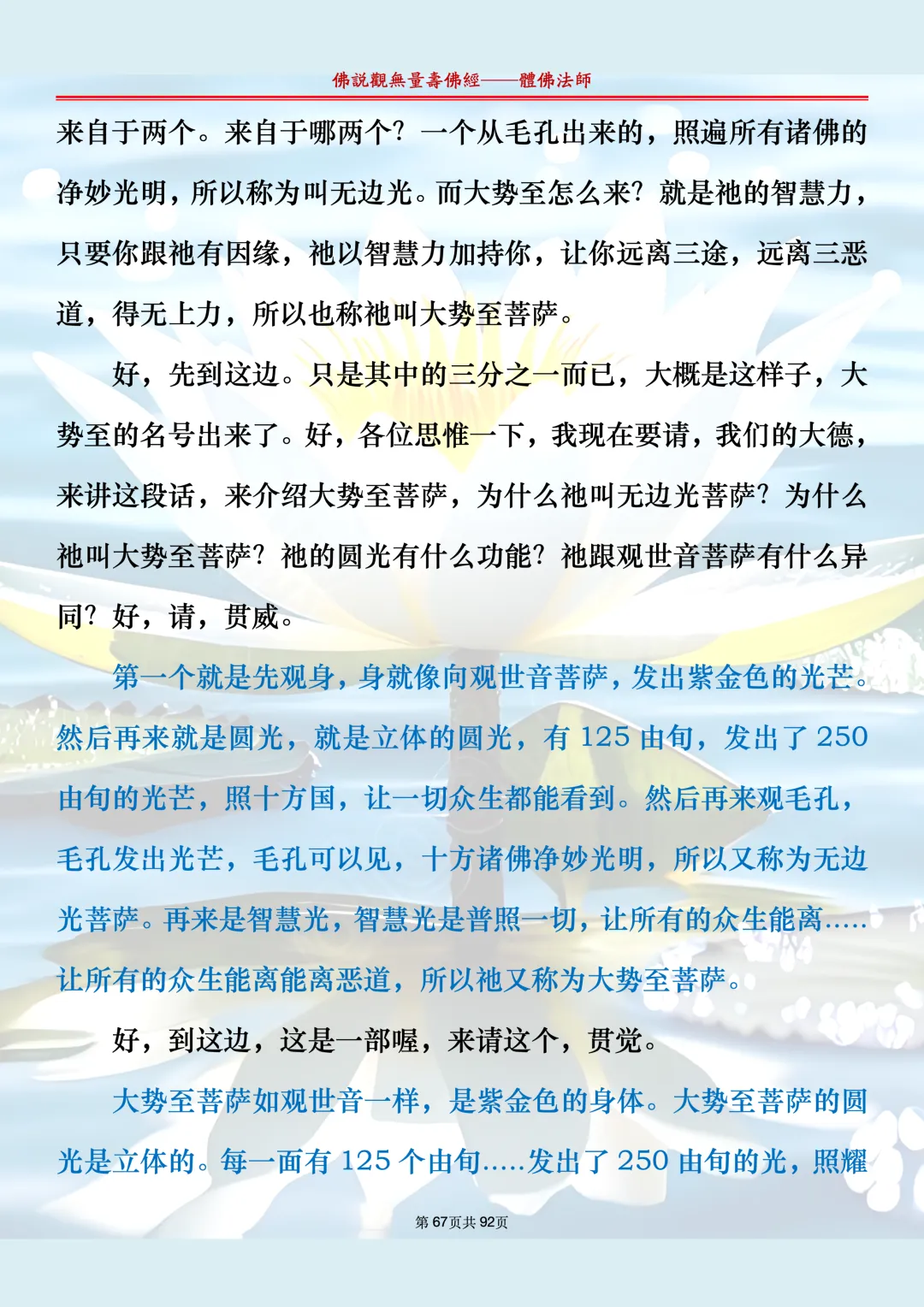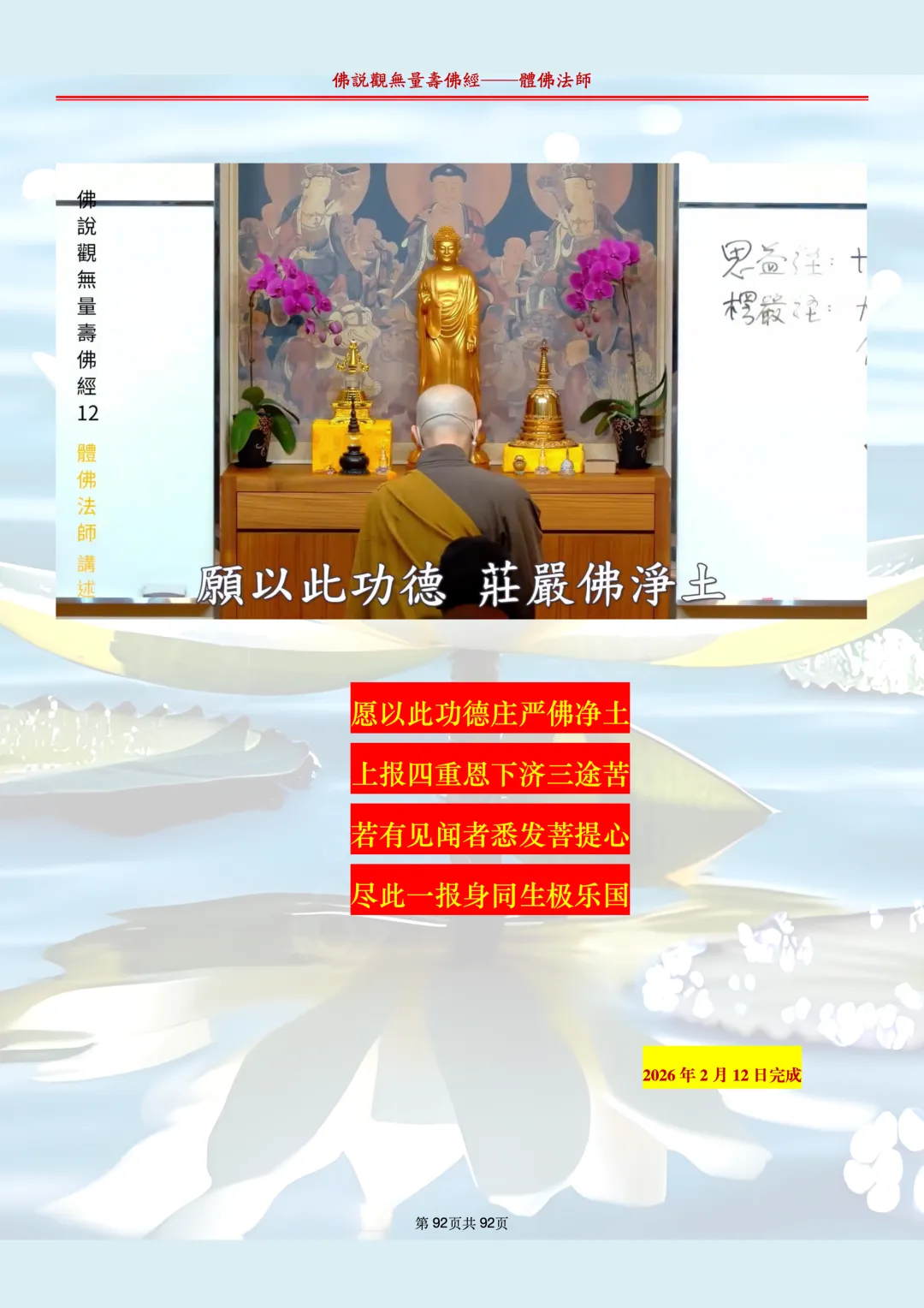 体佛法师讲解的《佛说观无量寿佛经》讲义,文字文档分享,是严格按照视频所讲,一句一句校对而整理,不出自任何团队,也不属于任何团队,也非视频转换软件提取的文字,所以文字准确率高。每一节课分成二段或者三段,依次分享。文字文档,是方便没有时间观看视频的情况下使用,非作他用,大家时间充裕的情况下,重点还是应以法师讲解的视频为主,文字是其次。