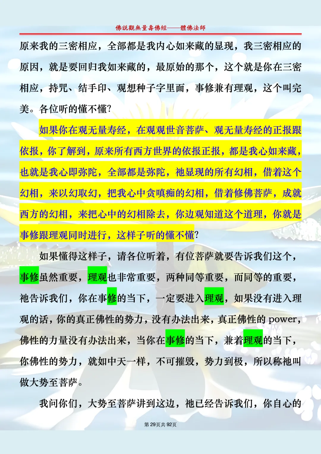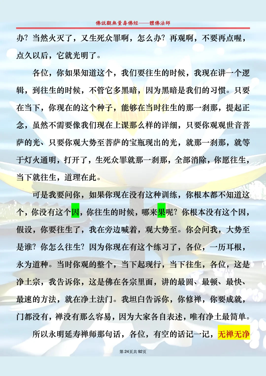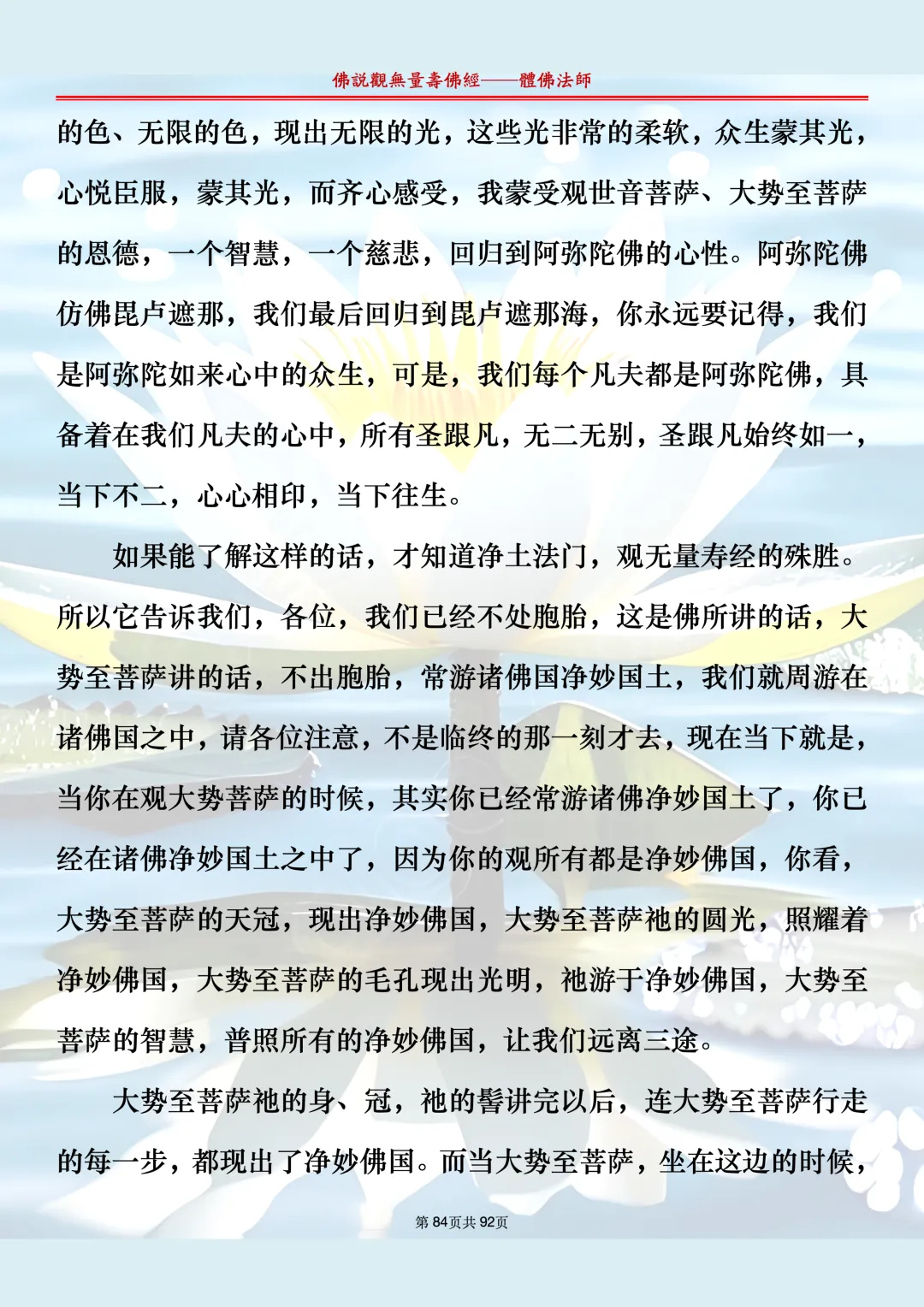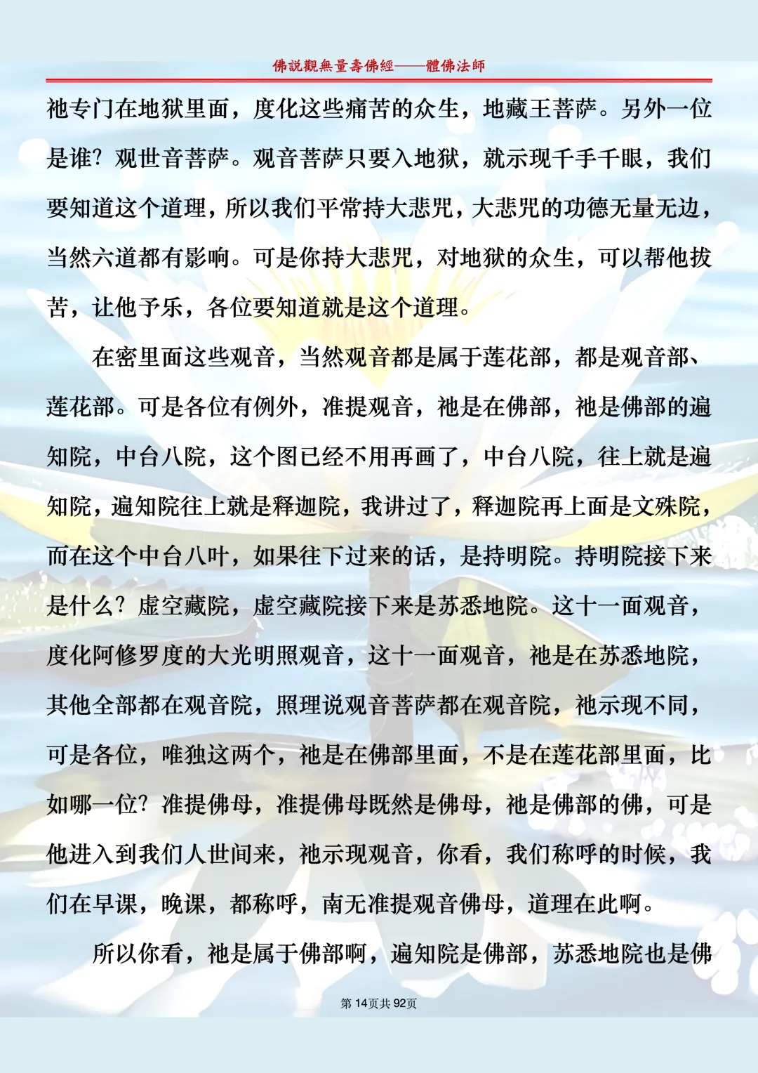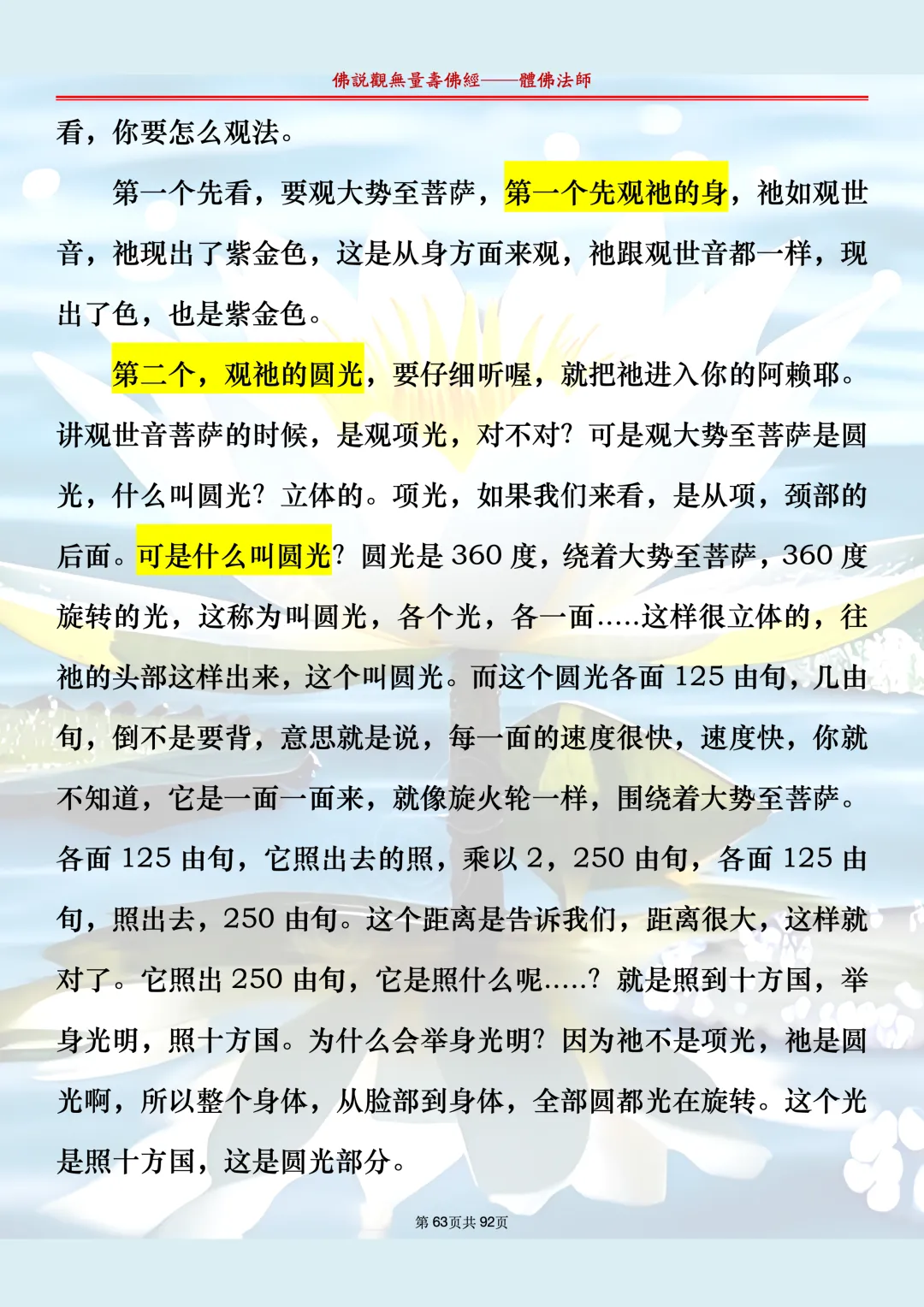 体佛法师讲解的《佛说观无量寿佛经》讲义,文字文档分享,是严格按照视频所讲,一句一句校对而整理,不出自任何团队,也不属于任何团队,也非视频转换软件提取的文字,所以文字准确率高。每一节课分成二段或者三段,依次分享。文字文档,是方便没有时间观看视频的情况下使用,非作他用,大家时间充裕的情况下,重点还是应以法师讲解的视频为主,文字是其次。