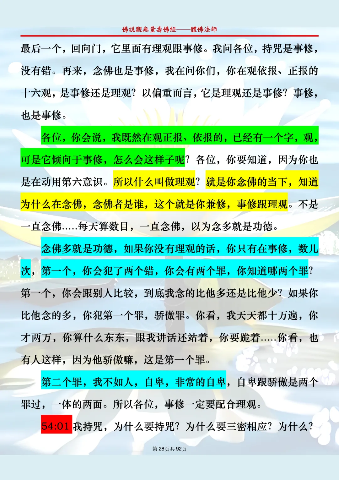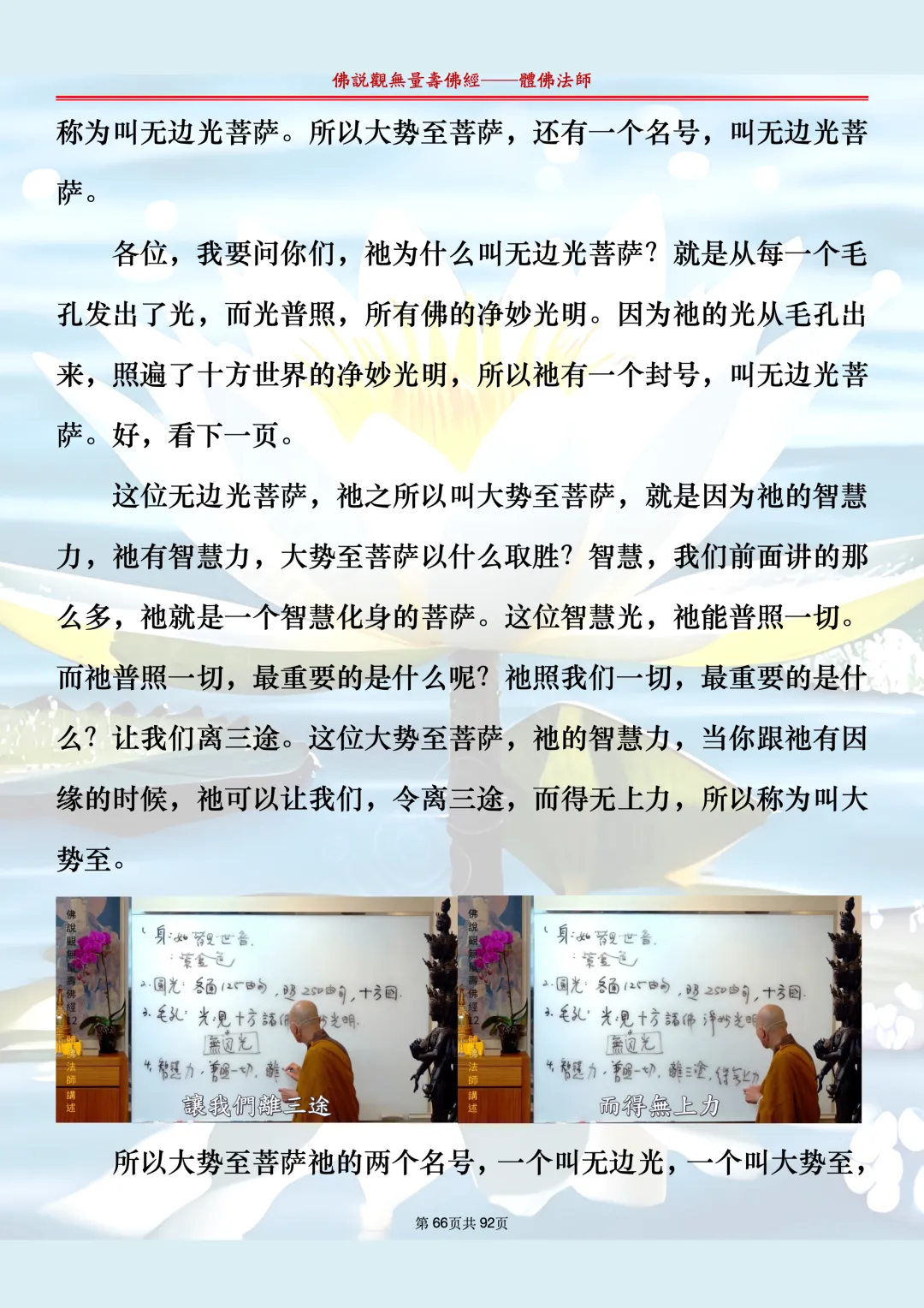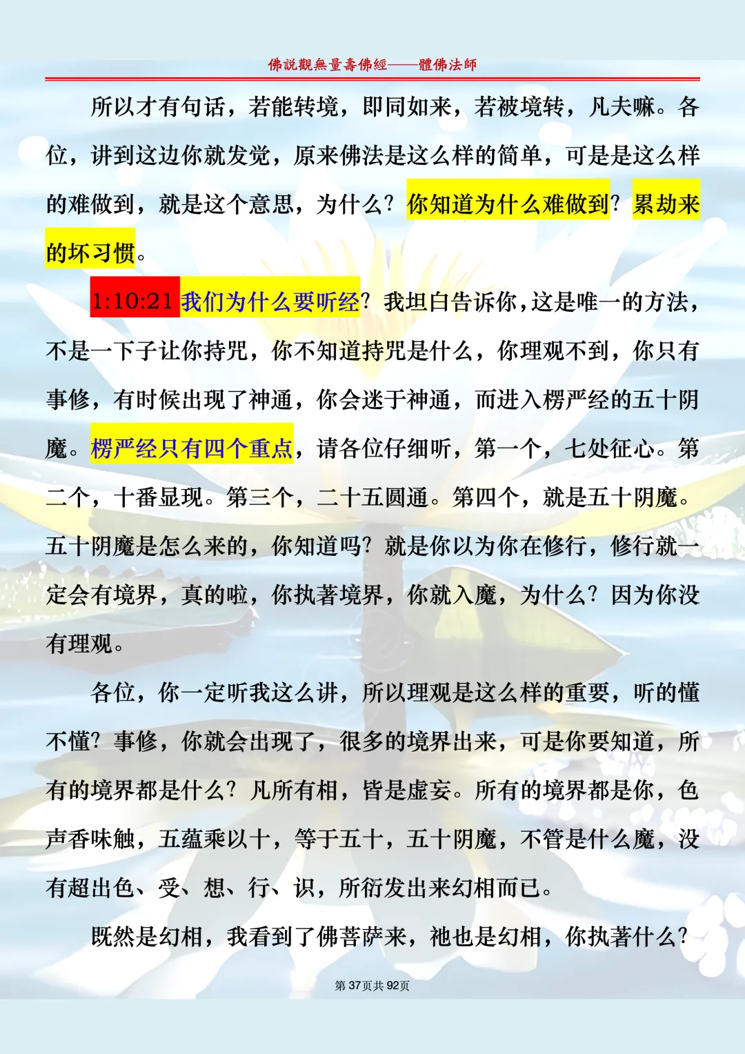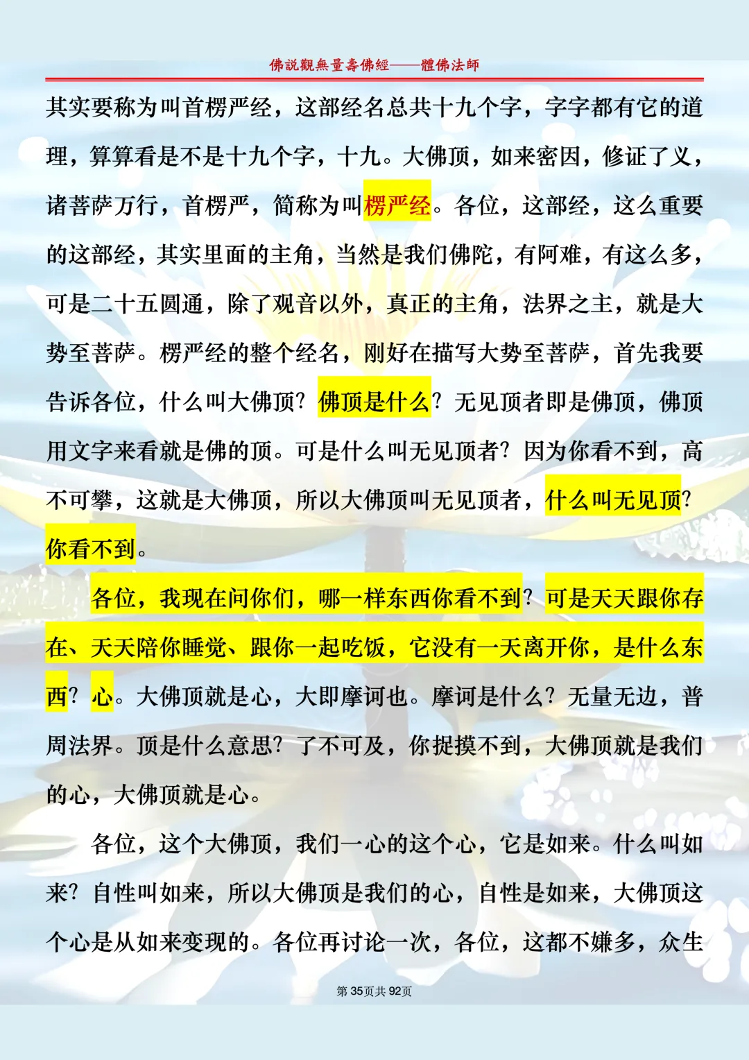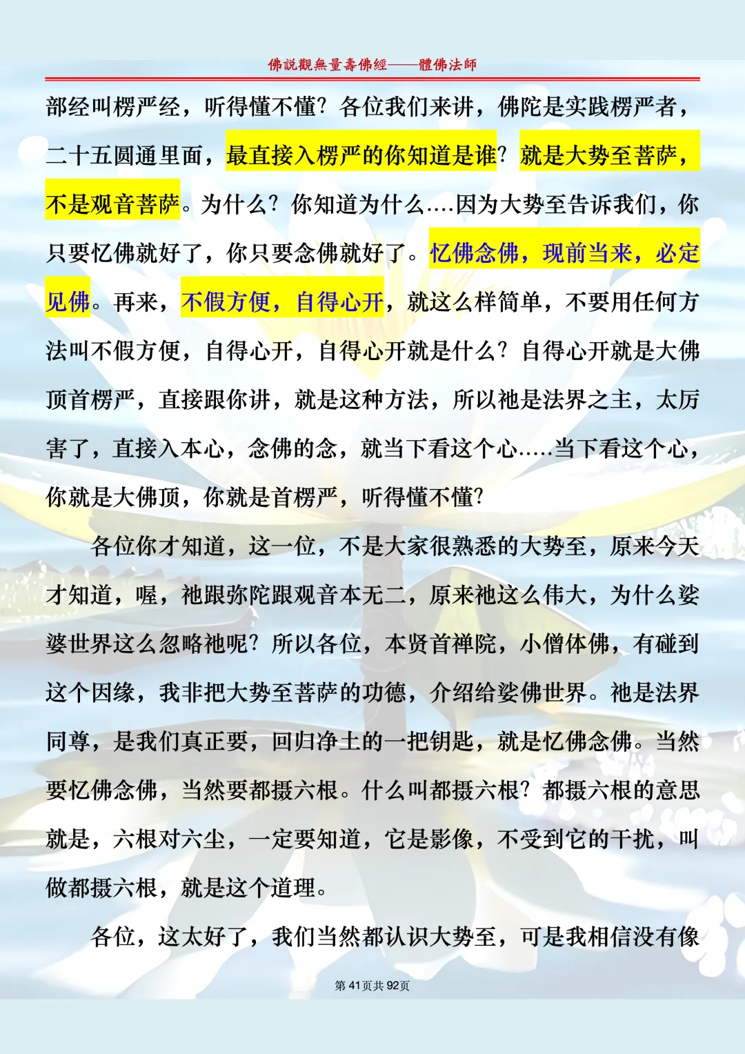体佛法师讲解的《佛说观无量寿佛经》讲义,文字文档分享,是严格按照视频所讲,一句一句校对而整理,不出自任何团队,也不属于任何团队,也非视频转换软件提取的文字,所以文字准确率高。每一节课分成二段或者三段,依次分享。文字文档,是方便没有时间观看视频的情况下使用,非作他用,大家时间充裕的情况下,重点还是应以法师讲解的视频为主,文字是其次。