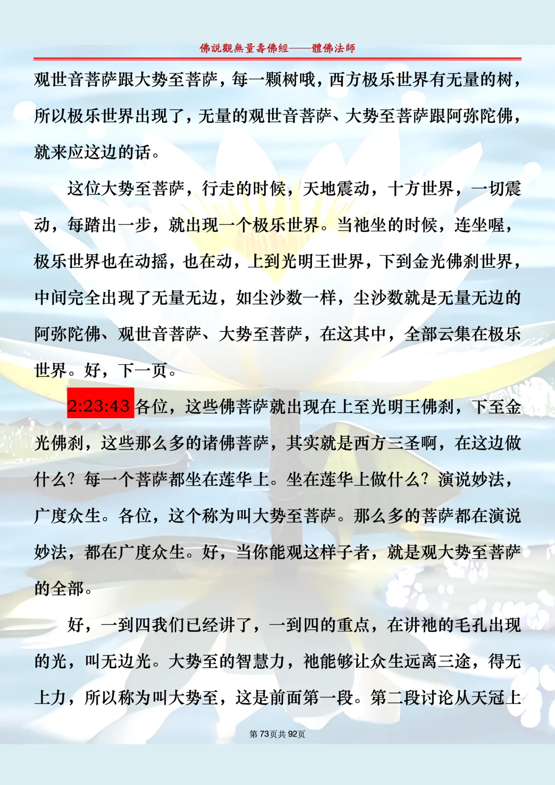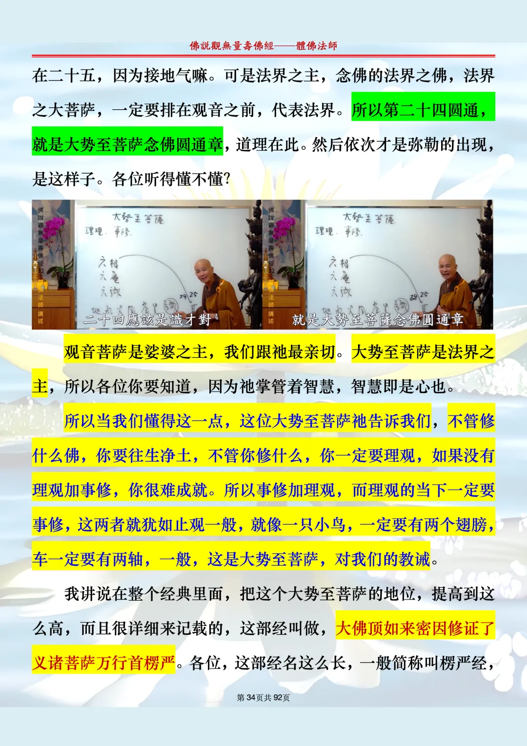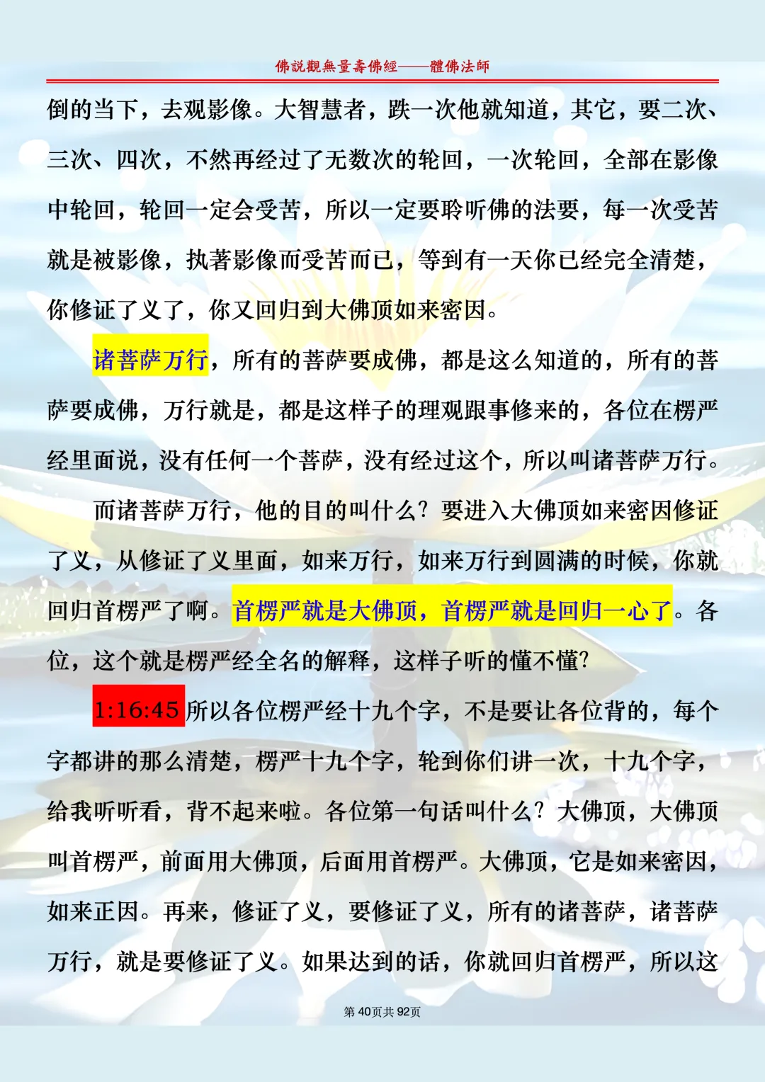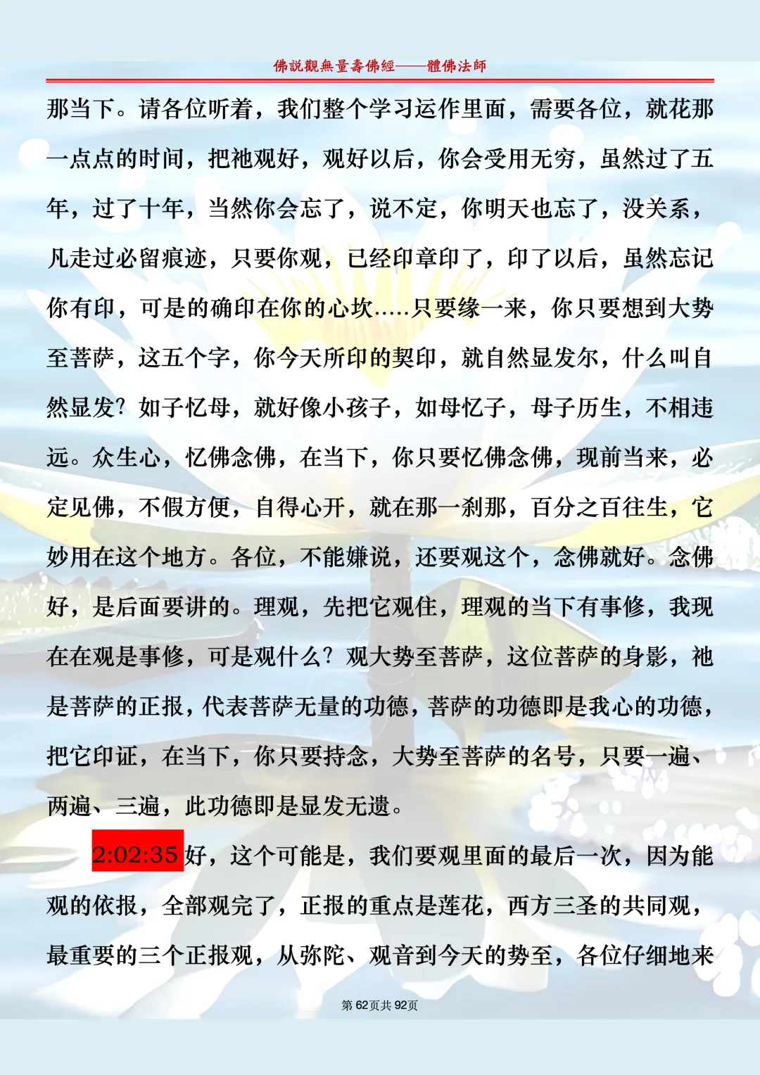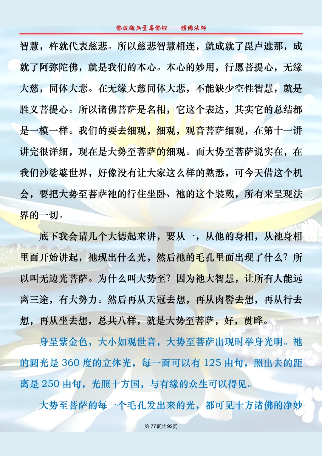 体佛法师讲解的《佛说观无量寿佛经》讲义,文字文档分享,是严格按照视频所讲,一句一句校对而整理,不出自任何团队,也不属于任何团队,也非视频转换软件提取的文字,所以文字准确率高。每一节课分成二段或者三段,依次分享。文字文档,是方便没有时间观看视频的情况下使用,非作他用,大家时间充裕的情况下,重点还是应以法师讲解的视频为主,文字是其次。