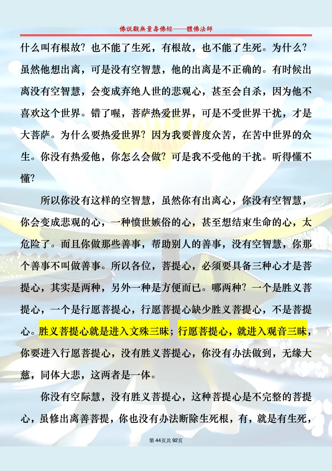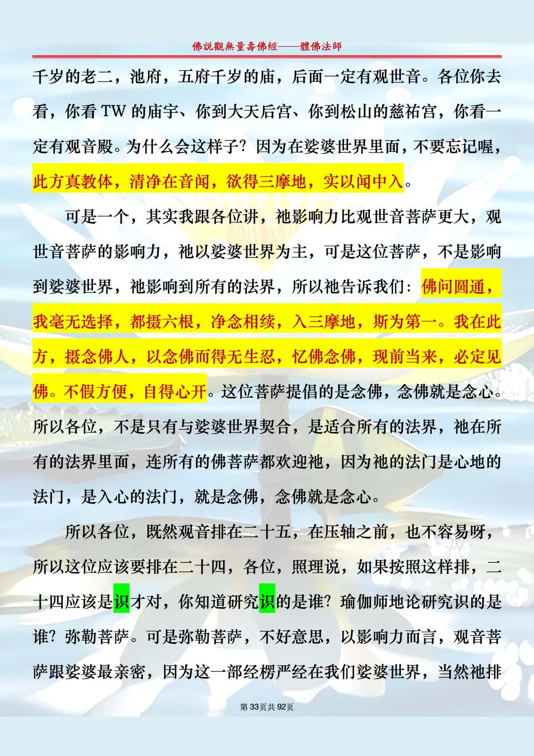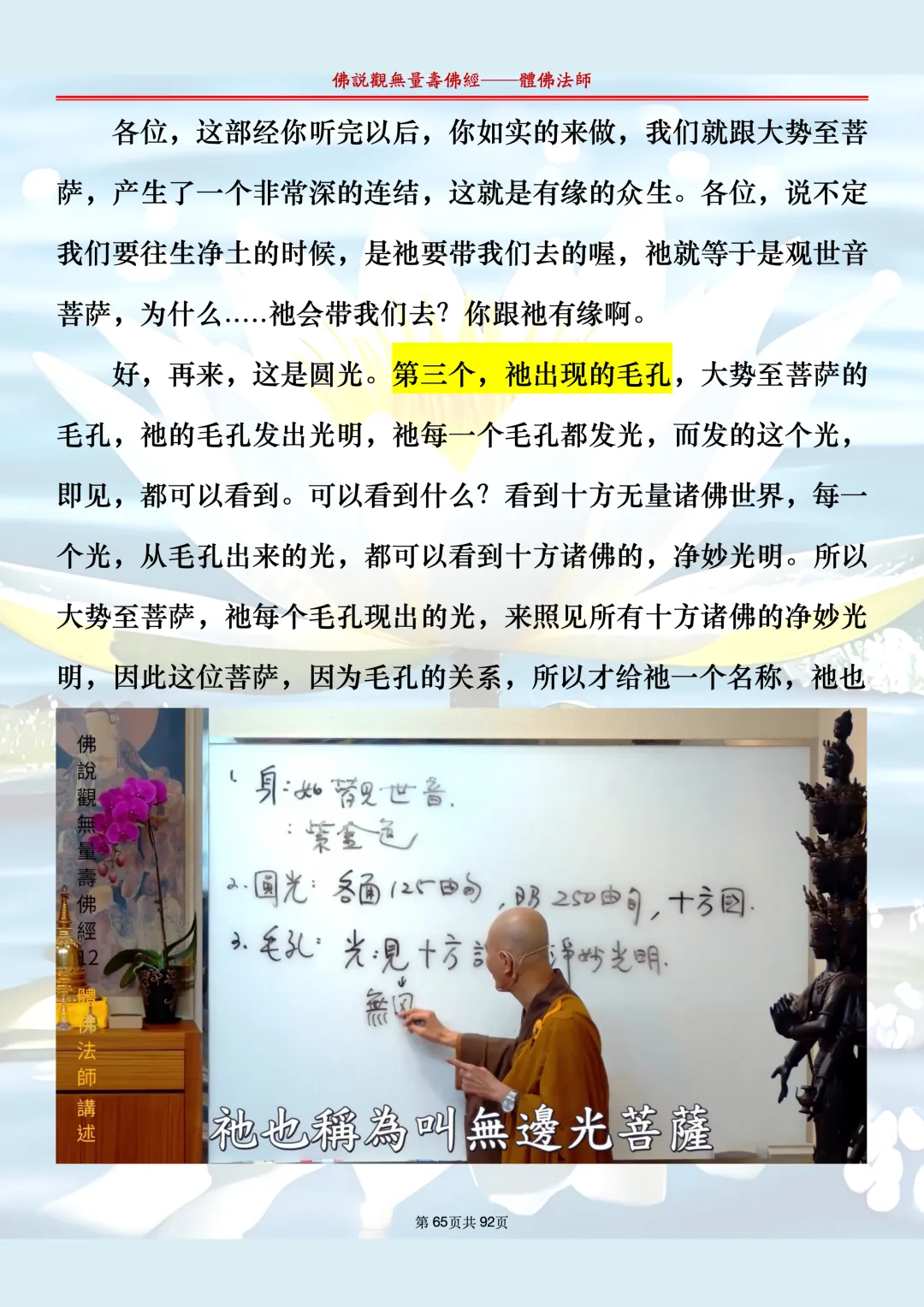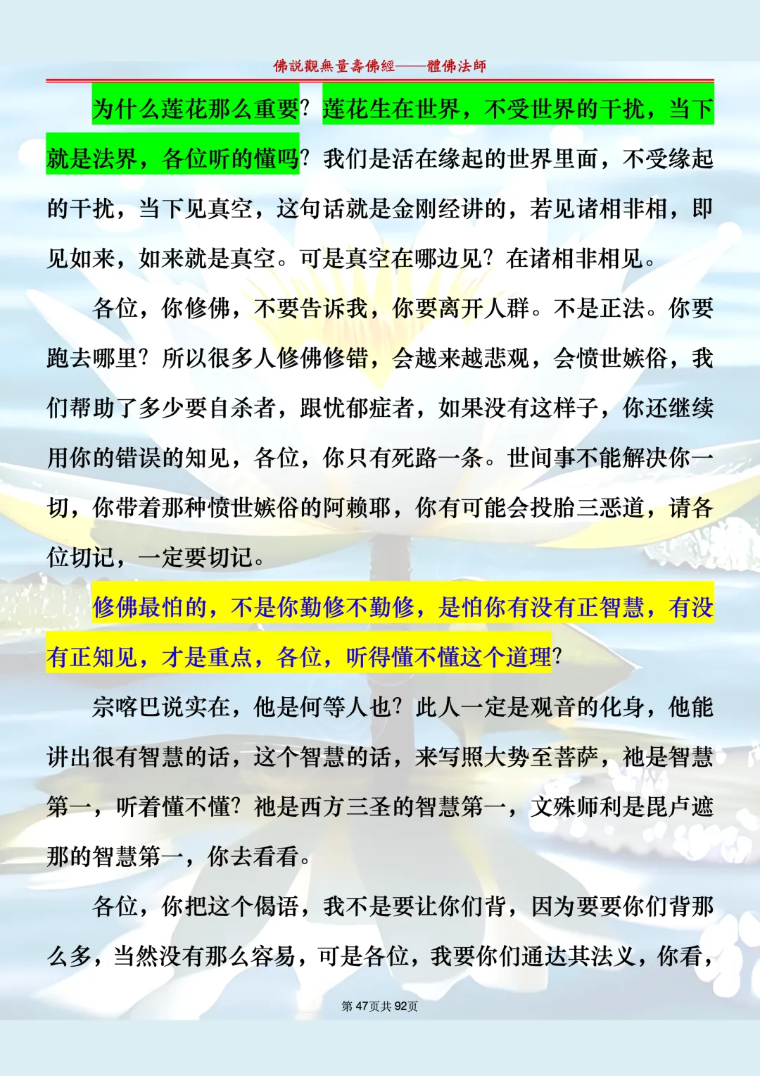 体佛法师讲解的《佛说观无量寿佛经》讲义,文字文档分享,是严格按照视频所讲,一句一句校对而整理,不出自任何团队,也不属于任何团队,也非视频转换软件提取的文字,所以文字准确率高。每一节课分成二段或者三段,依次分享。文字文档,是方便没有时间观看视频的情况下使用,非作他用,大家时间充裕的情况下,重点还是应以法师讲解的视频为主,文字是其次。