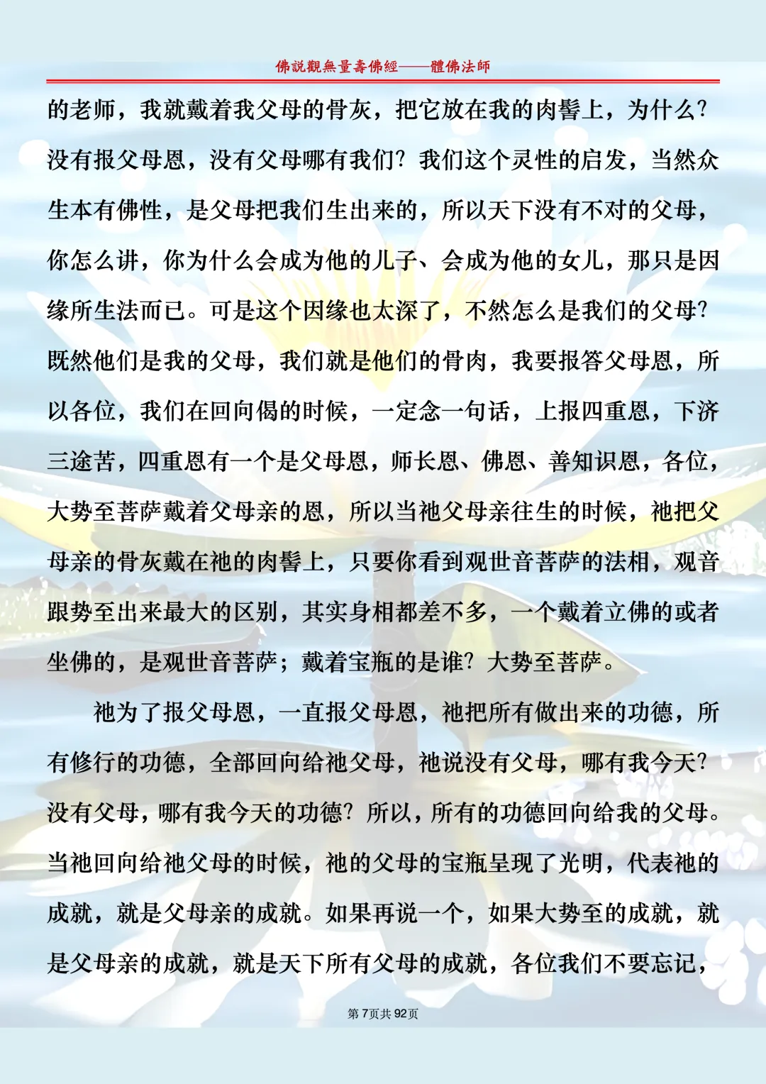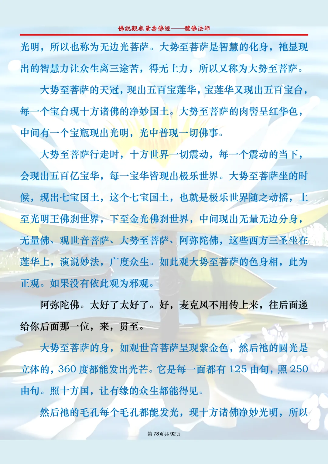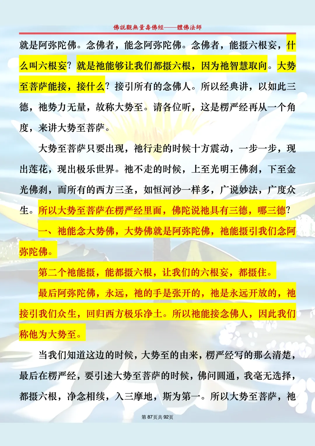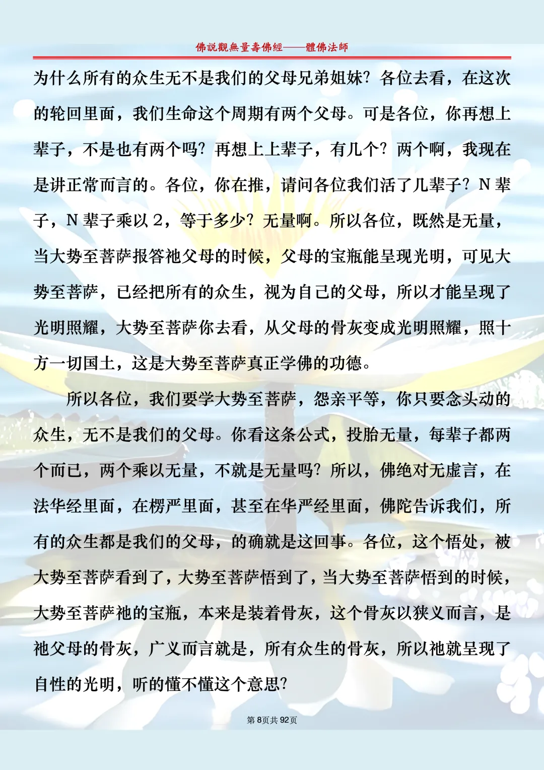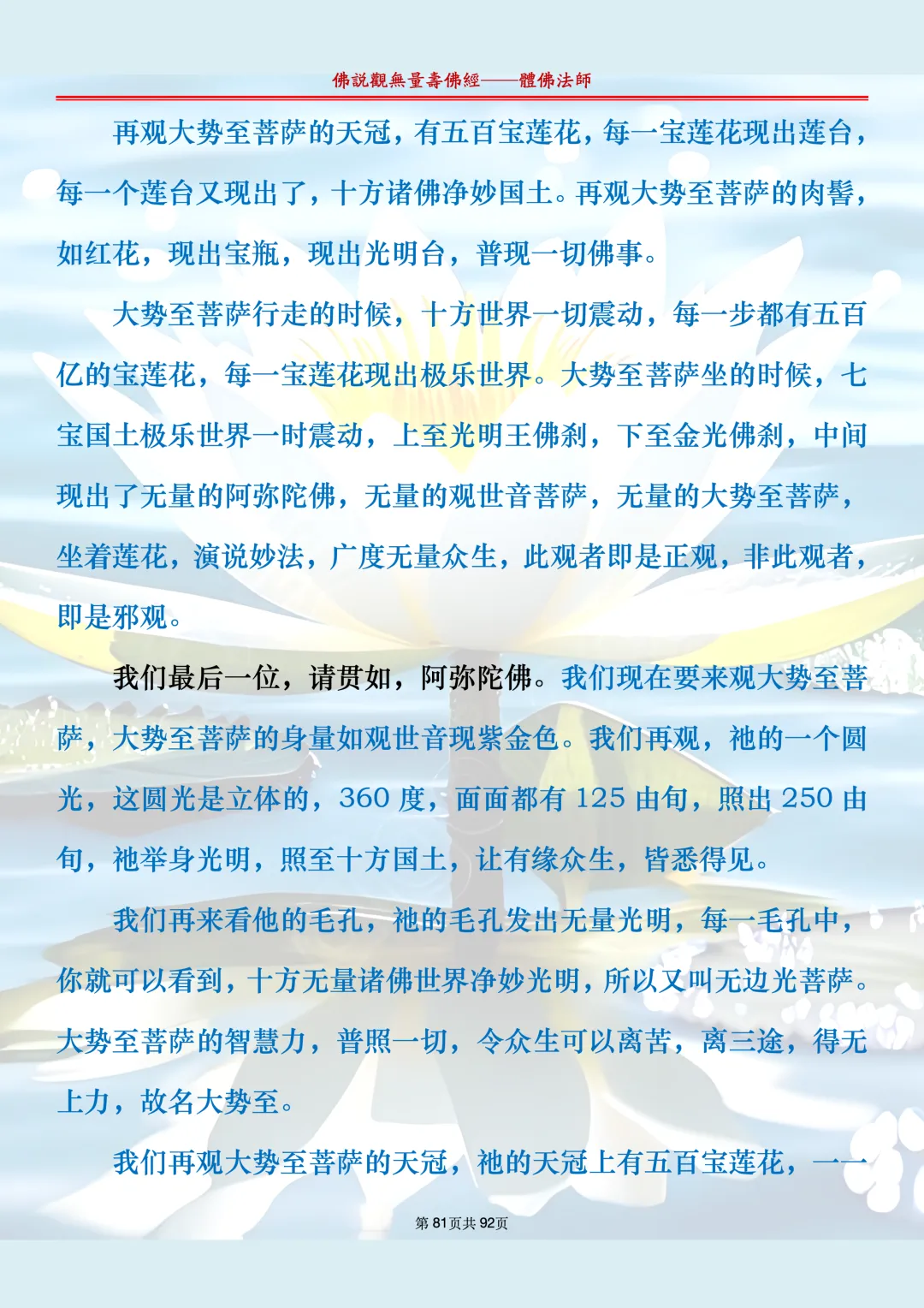 体佛法师讲解的《佛说观无量寿佛经》讲义,文字文档分享,是严格按照视频所讲,一句一句校对而整理,不出自任何团队,也不属于任何团队,也非视频转换软件提取的文字,所以文字准确率高。每一节课分成二段或者三段,依次分享。文字文档,是方便没有时间观看视频的情况下使用,非作他用,大家时间充裕的情况下,重点还是应以法师讲解的视频为主,文字是其次。